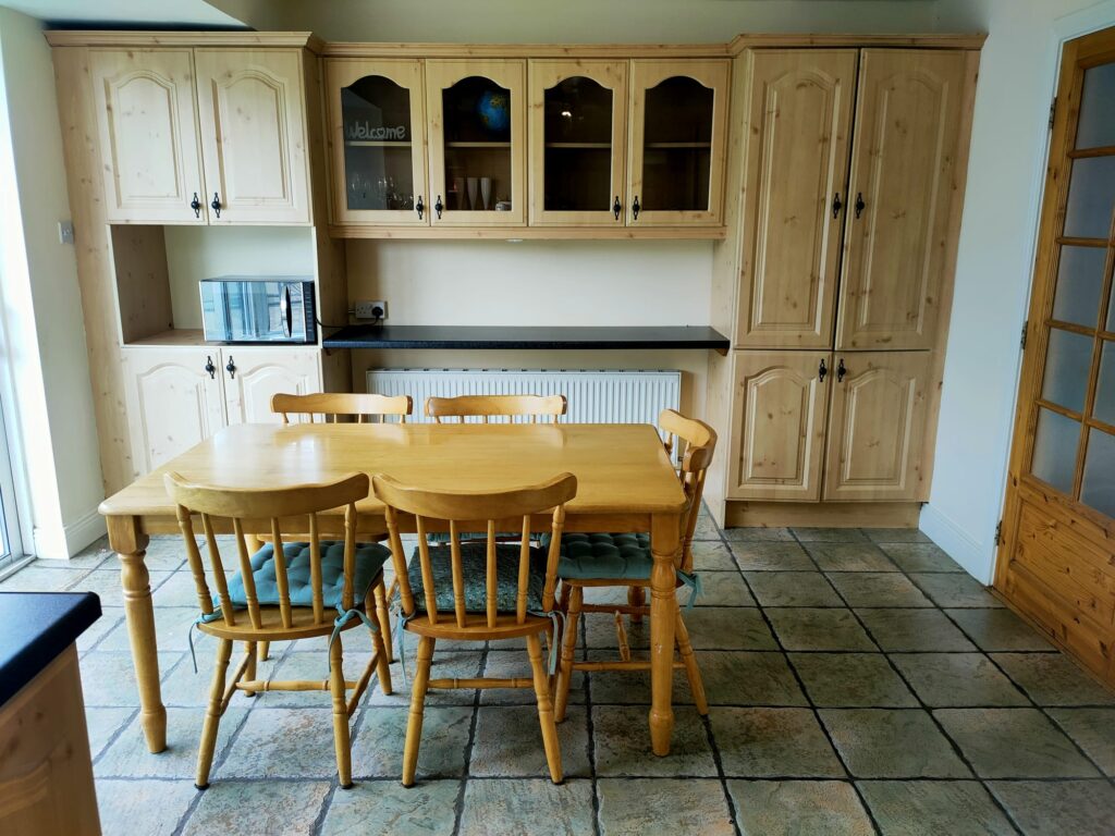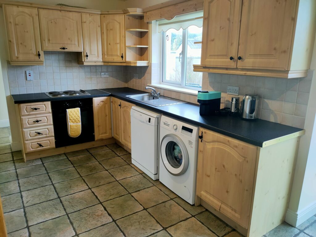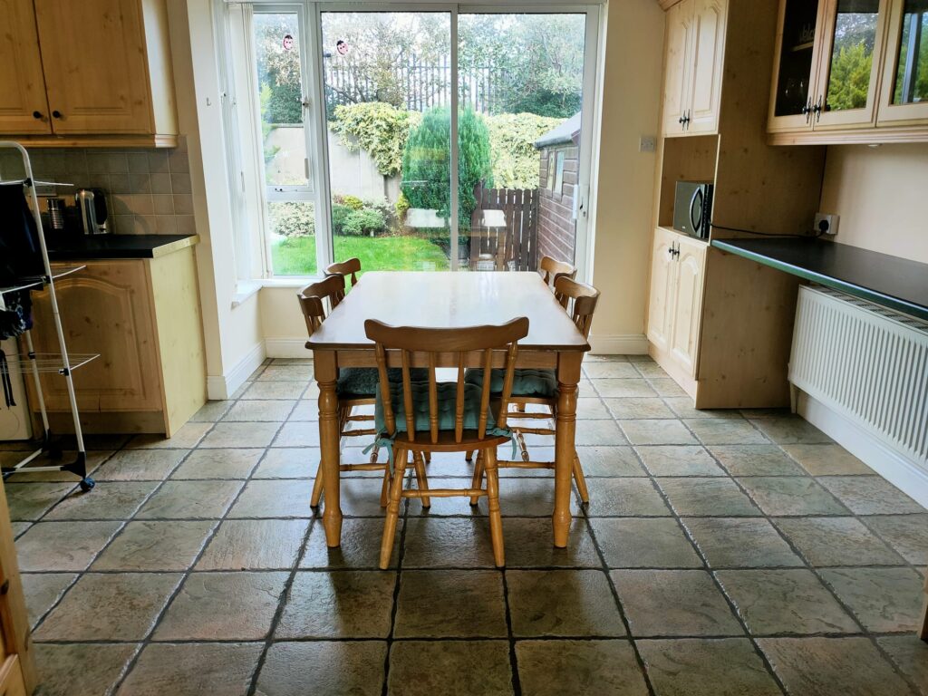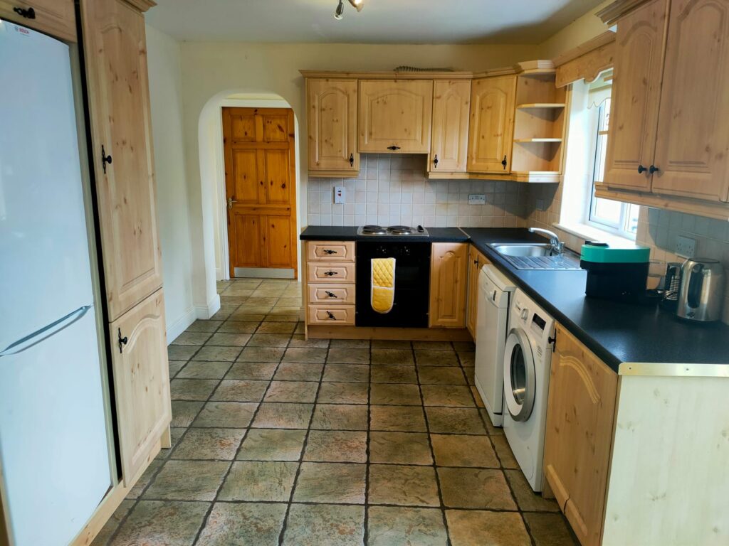 Kitchen/ Dining area 6.46mx 3.02m Tiled floor, extensive floor and eye level units, Bosch electric oven, hob with extractor fan, Bosch washing machine, Bosch dishwasher, integrated Bosch fridge freezer and sliding door to rear garden and wheelchair access archway to:
