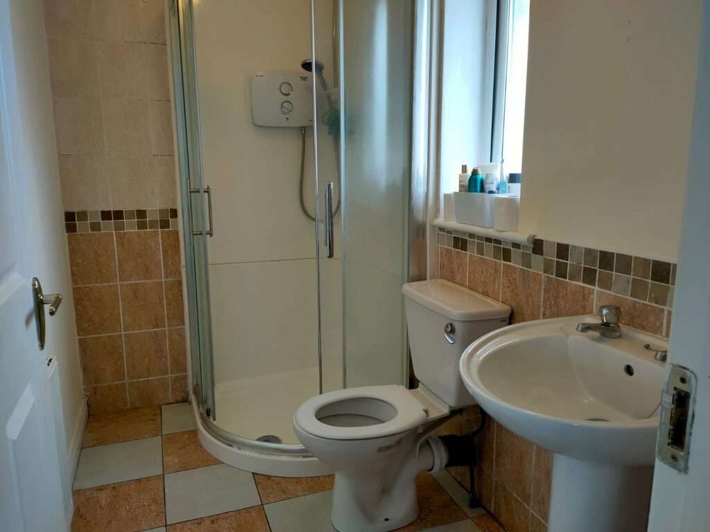 Ensuite 2.37m x 1.42m Tiled floor, w.c., w.h.b. and Triton t90sr electric shower with tiled surround.