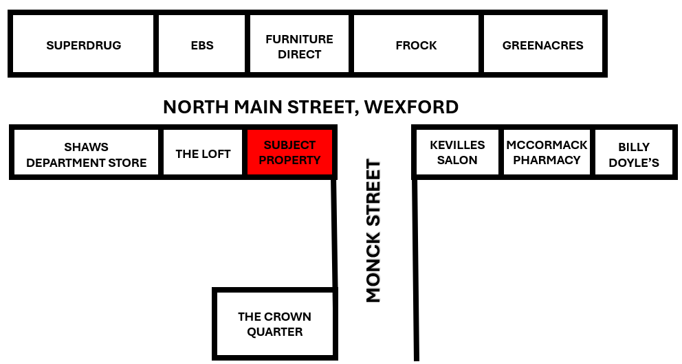 The subject property comprises a ground floor retail unit extending to c. 62 sq.m. / 667 sq.ft. located at 100 North Main Street, Wexford. This unit occupies a prominent corner position between Monck Street and North Main Street seeing high levels of passing pedestrian footfall. This location is a pedestrianised section of Wexford’s main thoroughfare linking The Bull Ring with Redmond Square through Selskar.