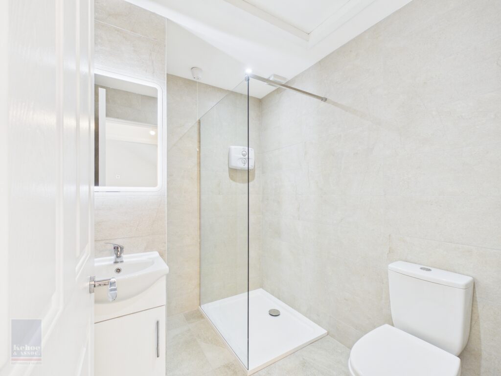 Shower Room 2.13m x 1.81m Newly refurbished throughout with tiled flooring, floor to ceiling tile surround, Triton 990 electric shower with glass  panel wall, w.h.b with cabinetry underneath and mirror and lighting overhead, hot-press behind with insulated tank and w.c.