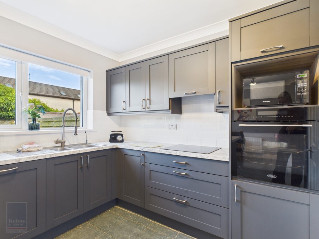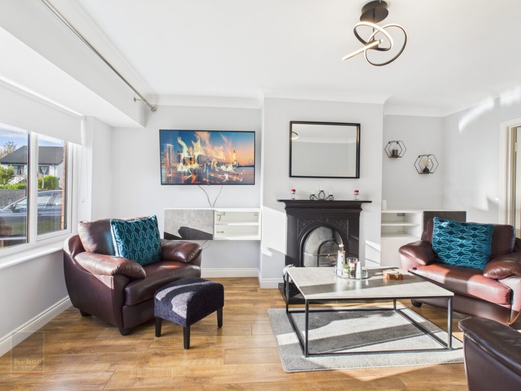 The interior is bright, welcoming, and thoughtfully designed. The entrance hallway leads to a newly installed guest WC under the staircase. The sitting room enjoys a large feature bay window, creating a light-filled space with an open fireplace perfect for relaxation. The kitchen/dining area, newly fitted in 2024 with a bespoke kitchen by Michael Mahon’s, includes high-end appliances and stylish finishes. French doors open directly onto a private patio and rear garden, making it ideal for entertaining or quiet evenings outdoors.