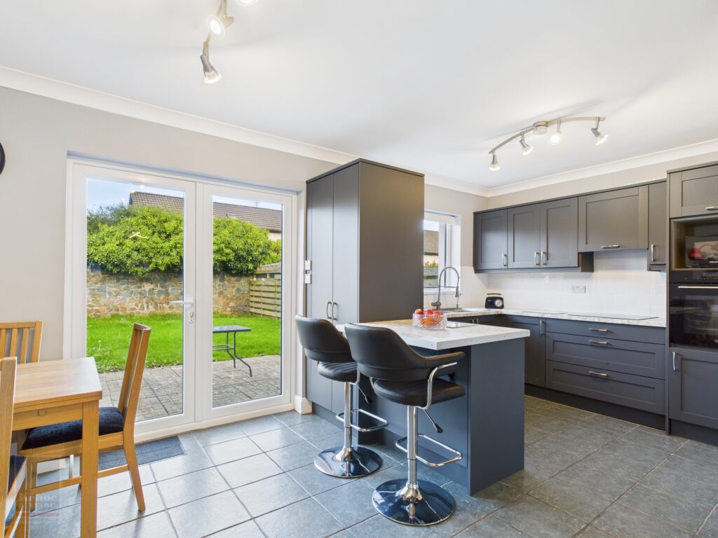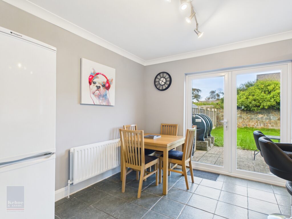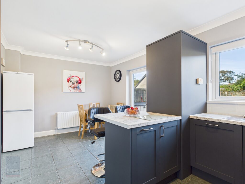 Kitchen/Dining Area 5.54m x 3.14m Tiled flooring throughout, new kitchen installed in 2024, fully fitted with floor and eye level cabinetry, drawers for bins, ample storage space, all soft close drawer sets, Whirlpool integrated dishwasher, double drainer stainless steel sink under large window overlooking rear garden, southeasterly facing garden with views of the old stone walls. Belling electric hob with extractor fan overhead, Belling oven and space for microwave, separate pantry space, breakfast counter area and utility space and Indesit washing machine and Nordmende dryer with clever space with basket for storage overhead, free standing Hotpoint fridge freezer. From Dining Area are double French doors leading out to east south facing patio and gardens in lawn.