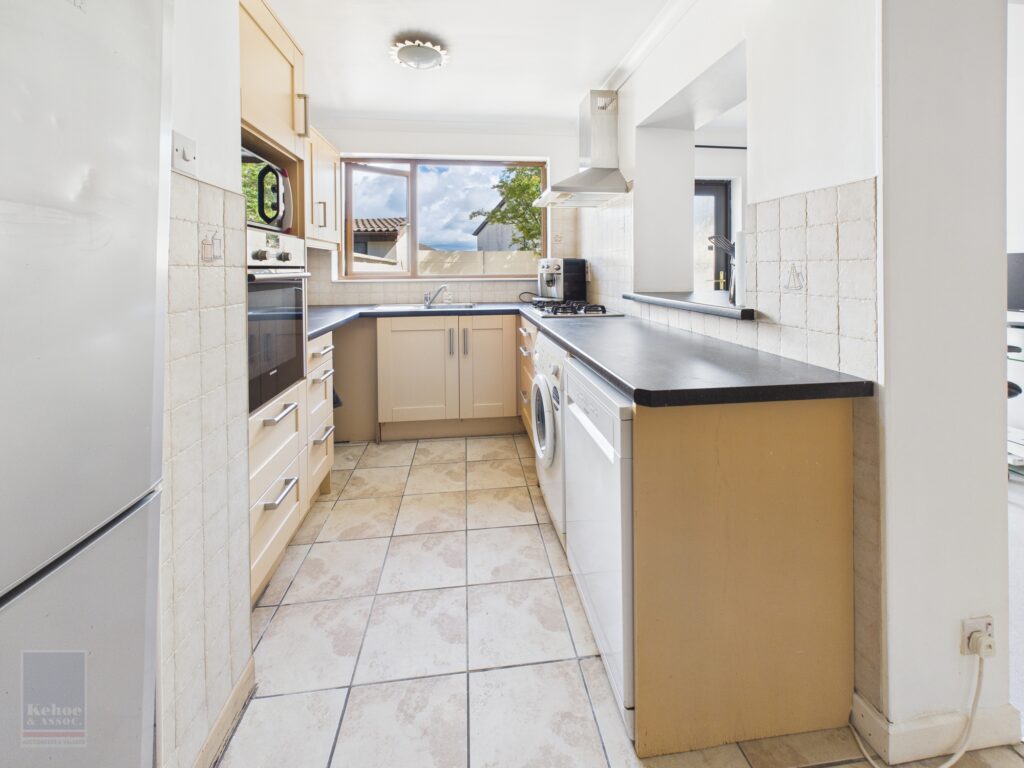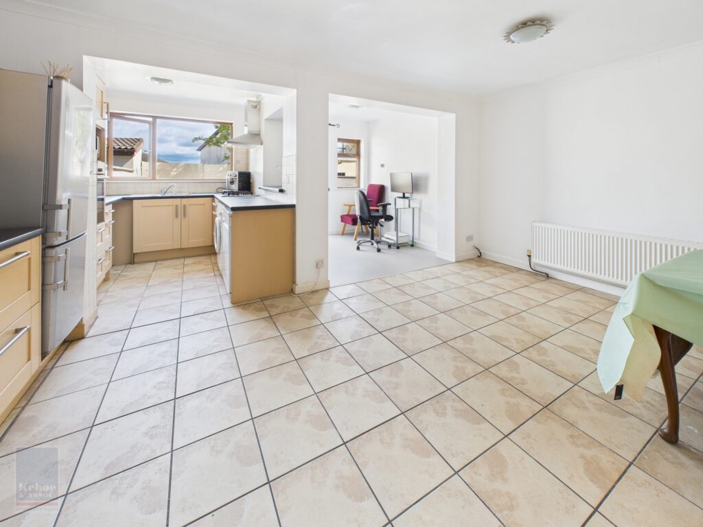 | Kitchen / Dining / Family Room | 5.13m x 5.41m | With excellent range of built-in floor and eye level units, gas hob, extractor, oven, washing machine, dishwasher, fridge freezer part tiled walls, tiled floor, 2 x built-in storage closets and door to outside. |