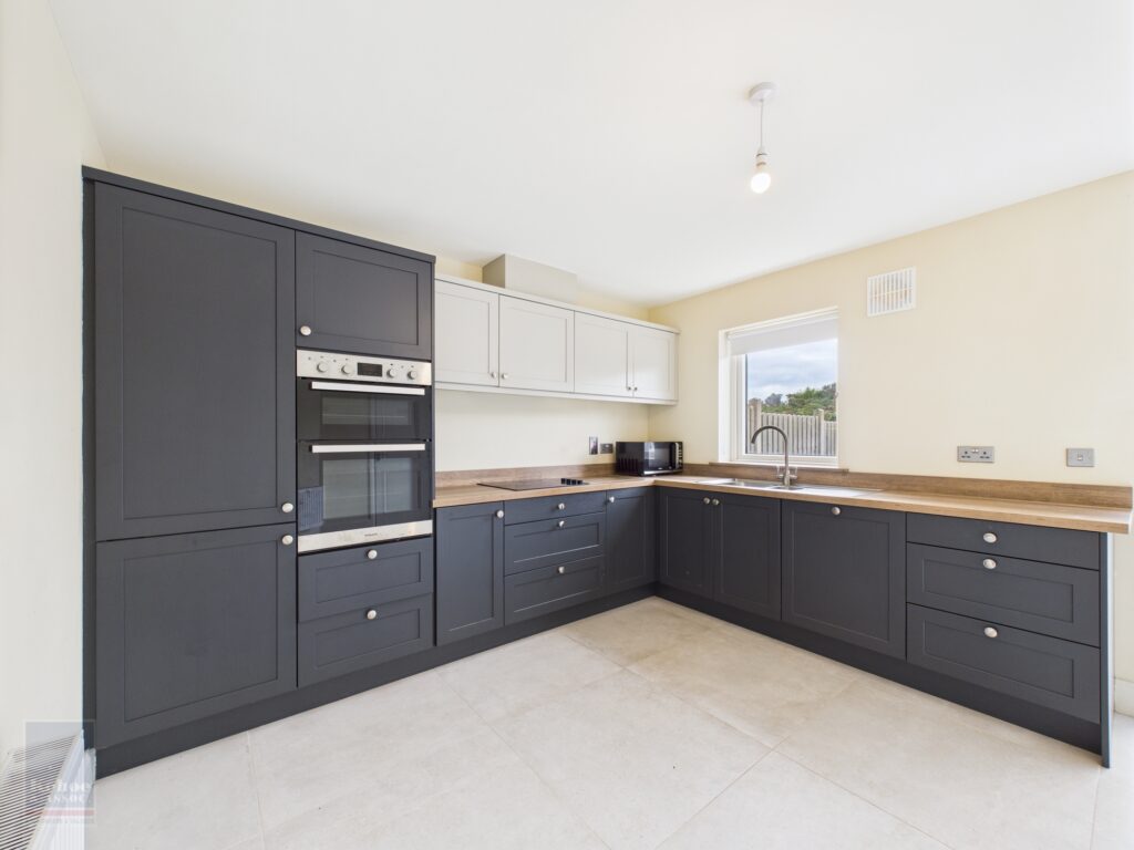 | Kitchen | 5.03m x 3.55m | Fitted kitchen – floor & eye level cabinets with worktops. Window overlooking rear garden with sea view. Integrated ceramic hob, double oven, integrated fridge freezer, integrated dishwasher and tiled floor. Double sliding doors leading out to large South facing patio area. |