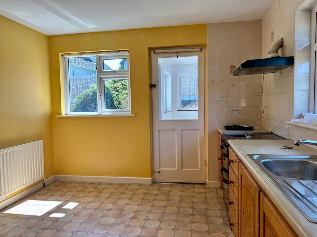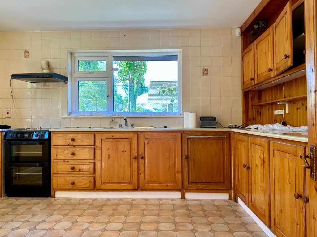 | Kitchen | 4.06m x 3.29m | Lino-flooring, fully fitted kitchen solid timber with floor and eye level cabinets and open shelves, ample worktop space, stainless steel sink and drainer, tile splashback under large window overlooking side garden, dual aspect with a second window overlooking rear garden, free standing Belling electric oven under Candy extractor fan, free standing Whirlpool fridge freezer. Door to: |