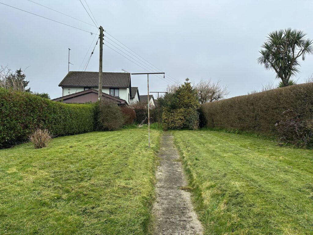 The front garden is primarily lawn, accompanied by a cobble driveway and footpath surround. A side entrance with a timber gate secures the south-westerly rear garden, which features a concrete patio and elevated lawns with a concrete path extending to the rear boundary. The garden is bordered with mature hedges and a variety of flowering shrubs.