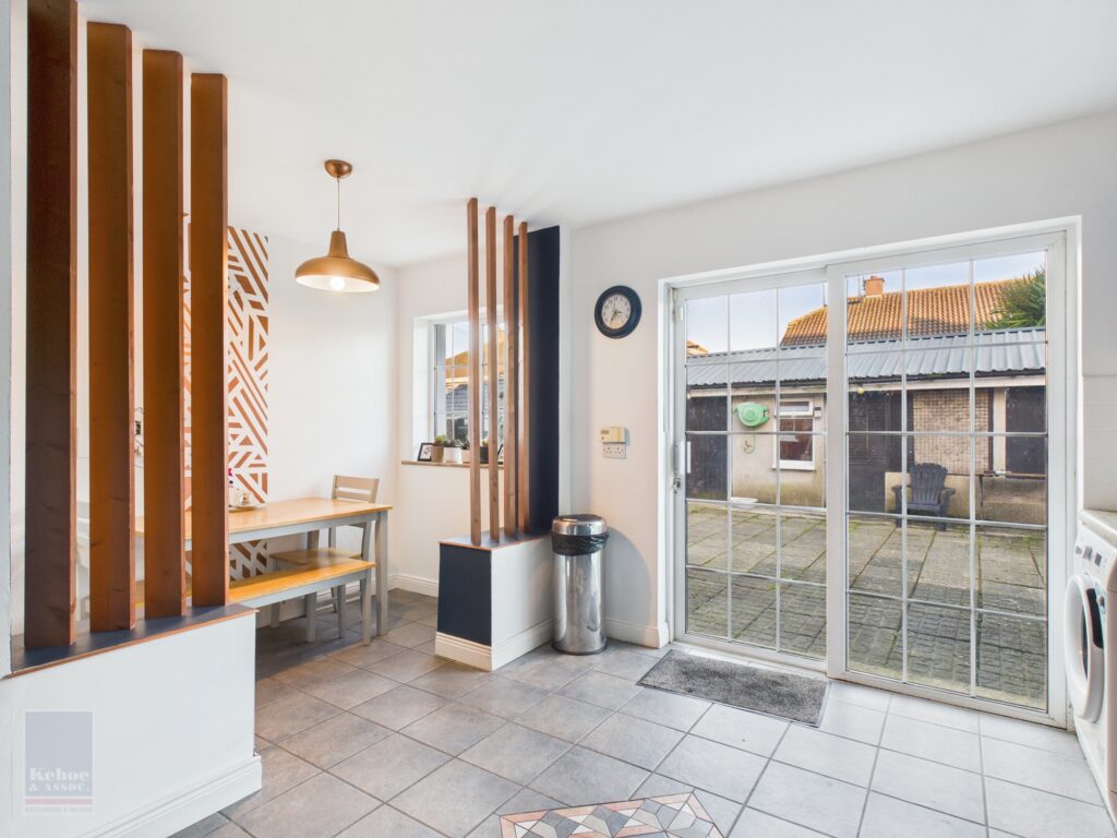 | Kitchen / Dining Room | 4.50m x 3.90m (max) | With tiled flooring, floor and eye level units with tiled splashback, electric oven, hob, extractor, plumbed for washing machine and sliding door to rear patio area. |