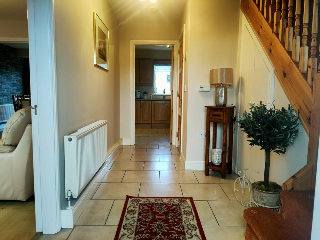 | Entrance Hallway | 5.17m x 1.18m | Tiled floor, wall mounted coat hanger, staircase to first floor with understairs storage press. |