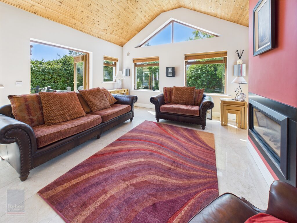 Sunroom 4.68m x 4.58m With vaulted RV sheeted ceiling, gas fire, marble tiled floor and double doors to outside.