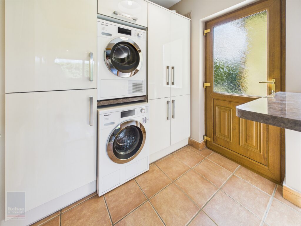 Utility Room 2.17m x 1.30m With excellent range of fitted units, integrated fridge freezer, plumbing for washing machine, tiled floor and door to outside.