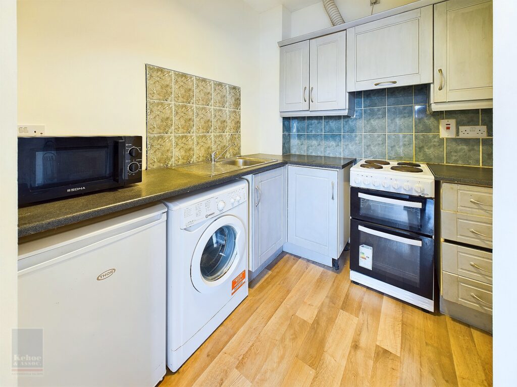 Kitchen 2.70m x 2.09m With built-in floor and eye level units, electric cooker, extractor, washing machine, fridge and part tiled walls.
