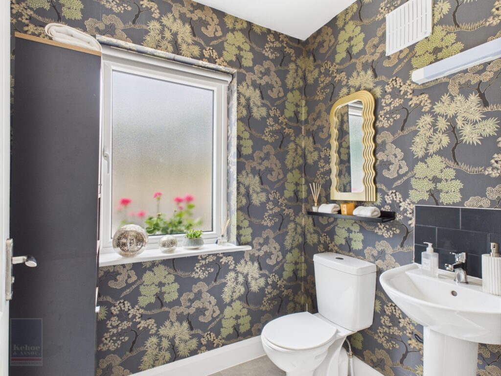 Guest Bathroom: 1.84m x 1.49m Tiled flooring, large frosted window overlooking front driveway, w.h.b. with tiled splashback and lighting overhead and w.c.
