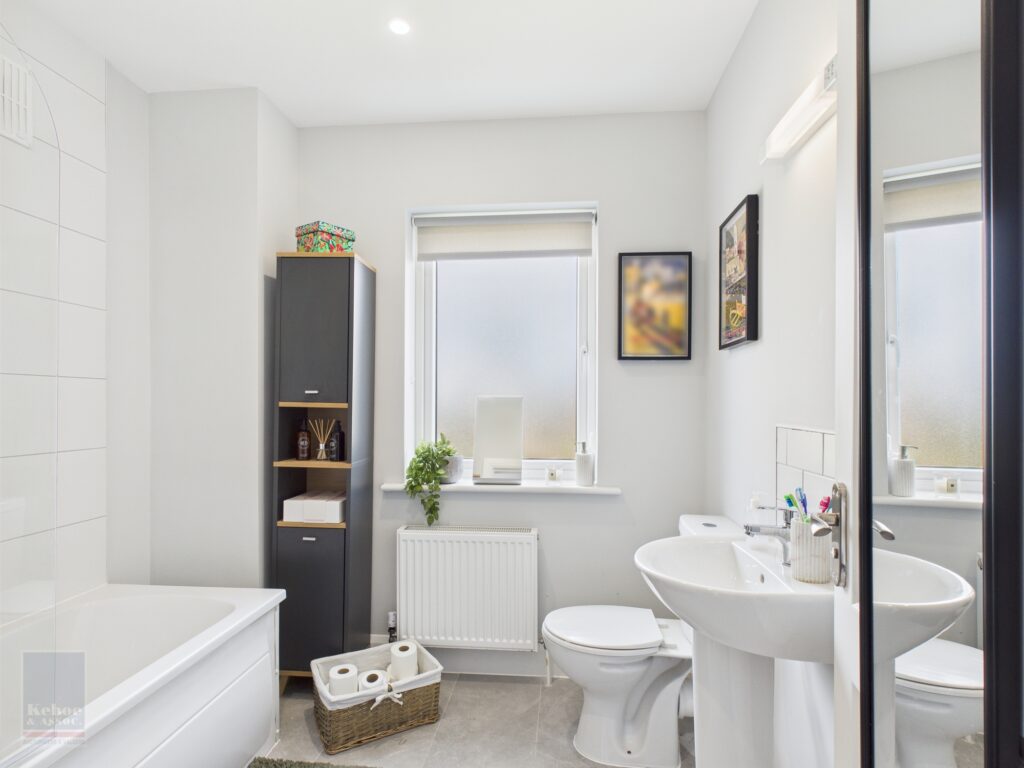 Family Bathroom 2.30m x 2.23m Fully tiled floor to ceiling, bath with shower overhead, w.h.b with tiled splashback and w.c.