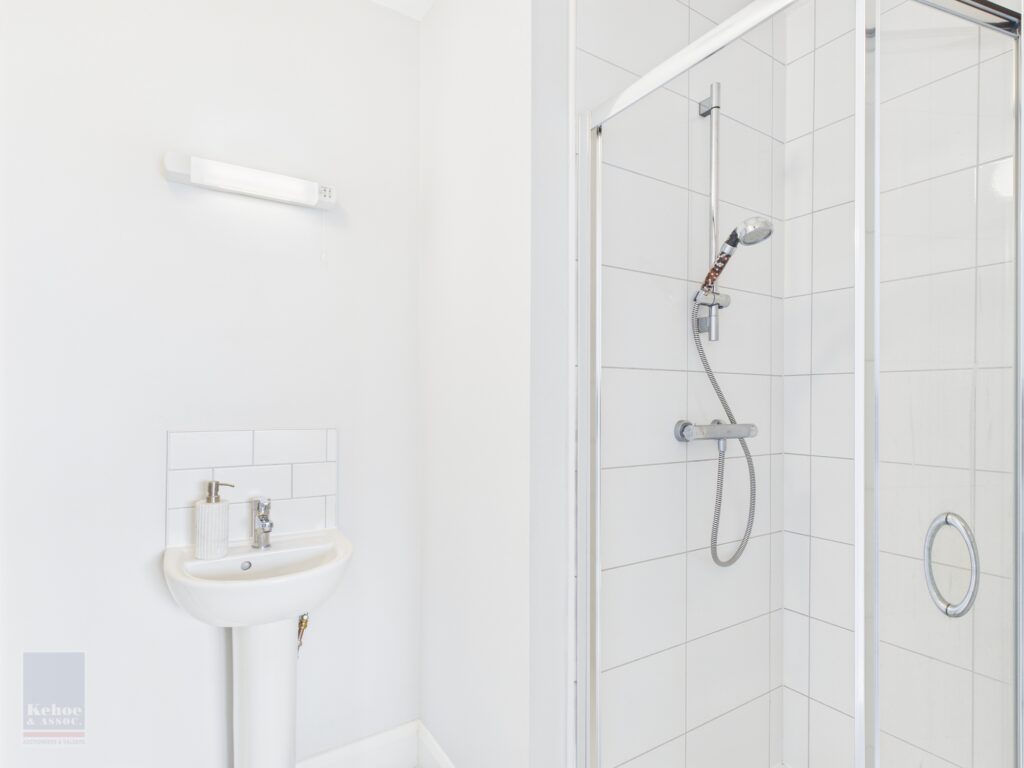 En suite: 2.78m x 1.56m Tiled flooring, enclosed shower with tiles floor to ceiling around, pressure pump shower with bi-folding glass doors, w.h.b. with subway tile backsplash, lighting overhead and w.c