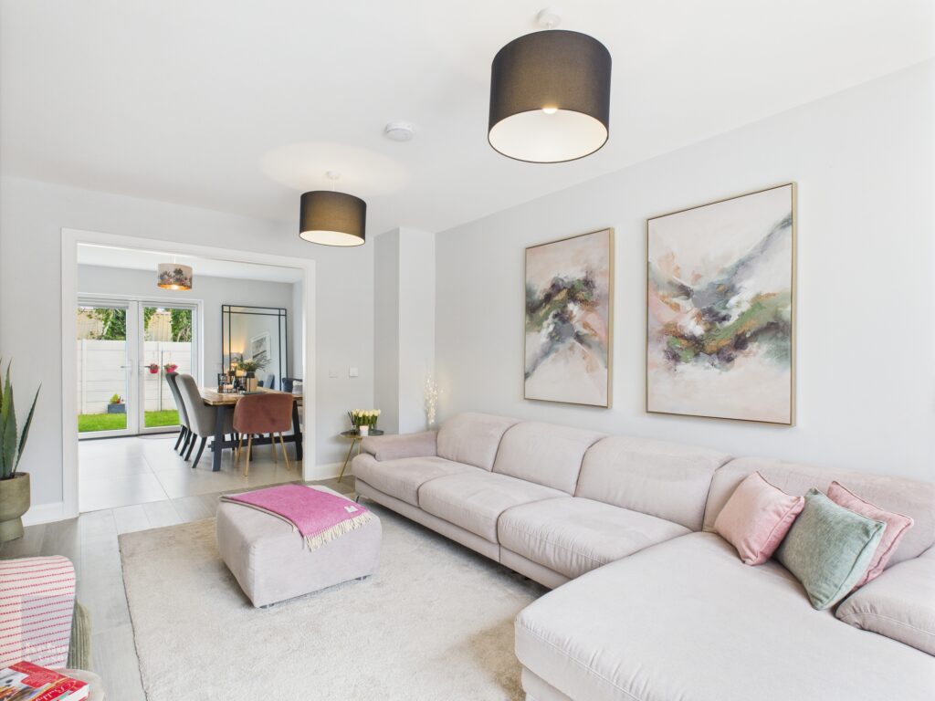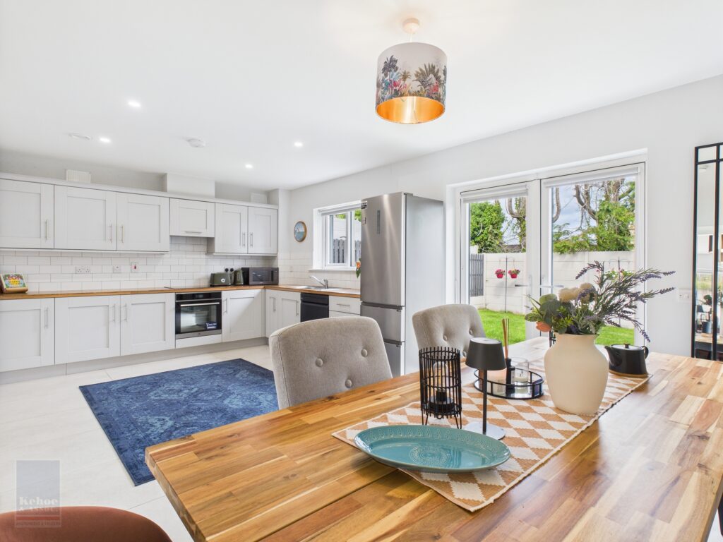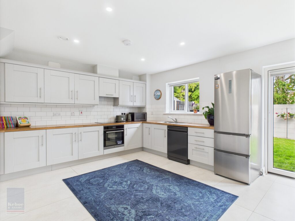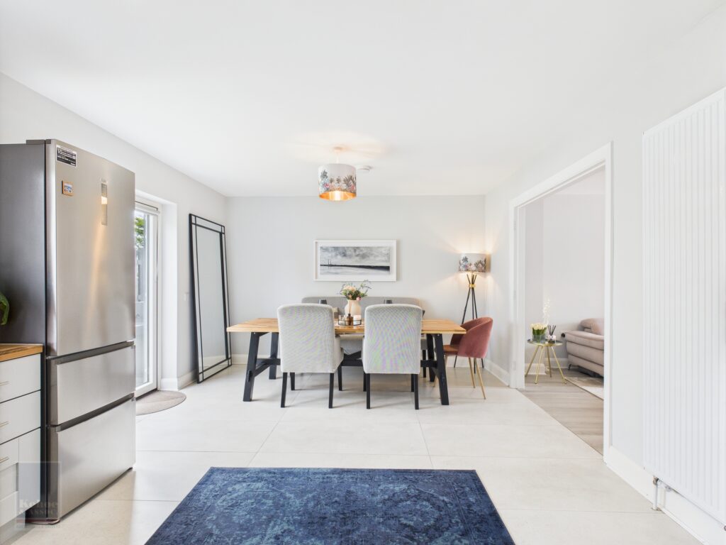 Kitchen/Dining Area 6.50m x 3.76m Tiled flooring throughout, floor and eye level cabinet, fully fitted kitchen with ample worktop space, tiled splashback, stainless steel sink and drainer under large window overlooking rear garden, Electrolux induction hob under extractor fan, built in Electrolux oven, Samsung dishwasher, Haier fridge freezer with freezer drawer set, French doors leading out to rear garden and upright radiator.