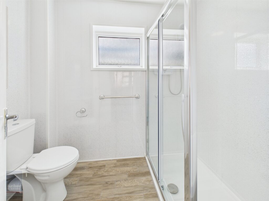 | Shower Room | 2.30m x 1.66m | Shower stall with electric shower, w.c., vanity w.h.b., walls fully clad with Grosfillex sheeting and laminate floor. |