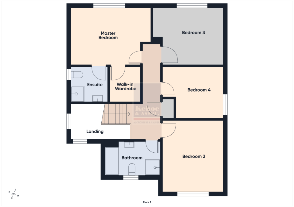 | Ensuite | 2.03m x 2.07m | With w.c., w.h.b., tiled floor & splashback, tiled shower stall with power shower and automated lighting.