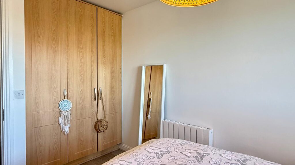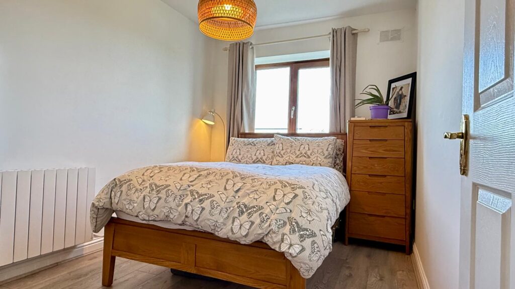 The living area flows effortlessly into a fully modernised kitchen and dining space, which has been completely redesigned to a premium standard. This impressive kitchen incorporates high-quality fitted units, a Belfast sink, and a range of integrated appliances, all of which are less than four years old. A central hallway, complete with hot press, leads to two generously proportioned bedrooms, each benefiting from bespoke built-in wardrobes. The bathroom has also been upgraded and now features a contemporary suite, enhanced by a new shower door and elegant, high-quality tiling.