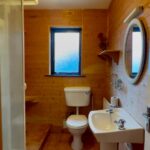 Family Shower Room 2.54m x 1.78m Tiled flooring, enclosed shower with Triton T90 z electric shower, timber cladding across all walls, w.h.b with mirror and lighting overhead and w.c., wall mounted cabinetry space.