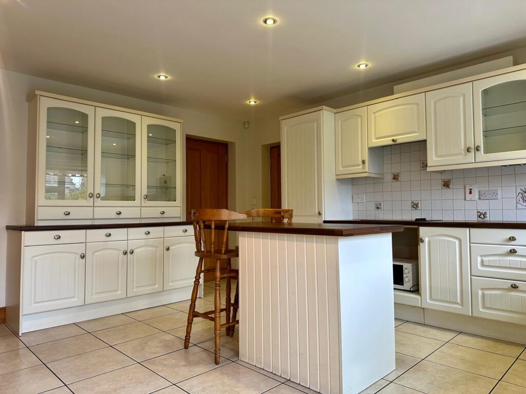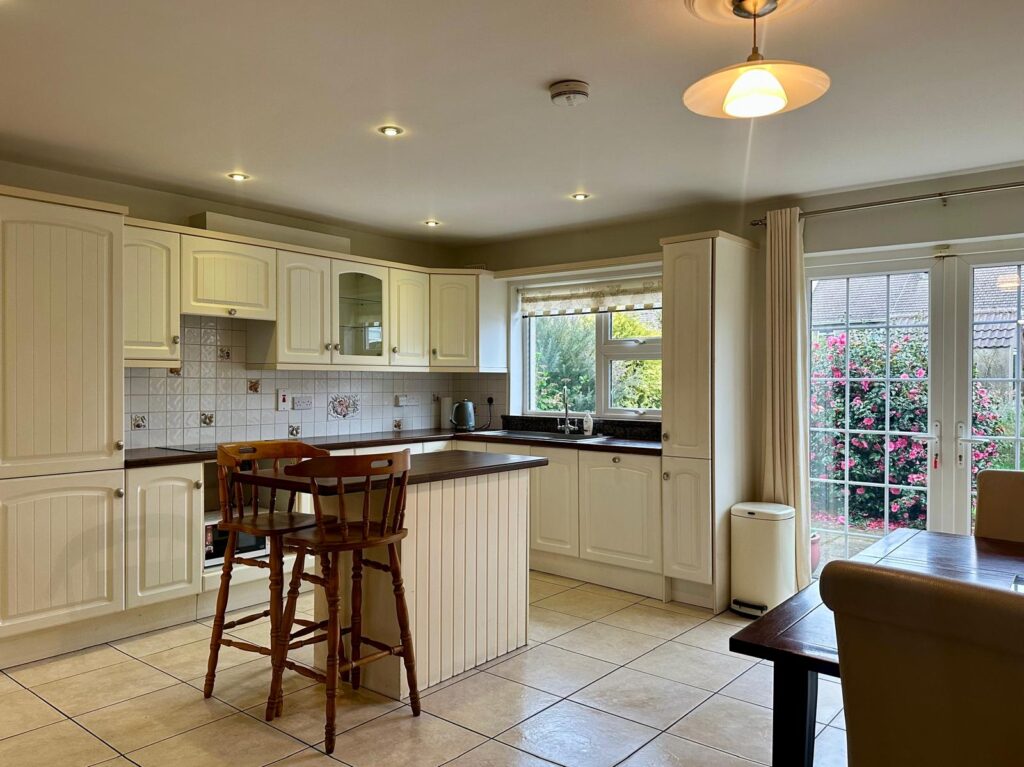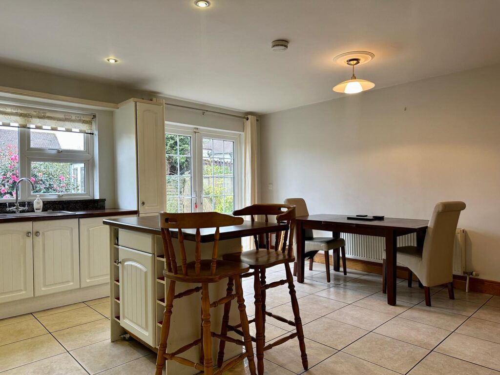 | Kitchen/Dining Area | 4.87m x 4.79m | Tiled flooring throughout, fully fitted kitchen with floor eye level cabinets, ample worktop space, island with breakfast counter space, fully fitted display and storage area, stainless steel sink and drainer, granite uprise, and granite stone windowsill under large window overlooking rear garden. Space for electric oven, Candy 4-ring electric hob under extractor fan overhead, integrated Belling fridge freezer, integrated Whirlpool dishwasher. French doors leading to patio area to long garden. Door leading to: |