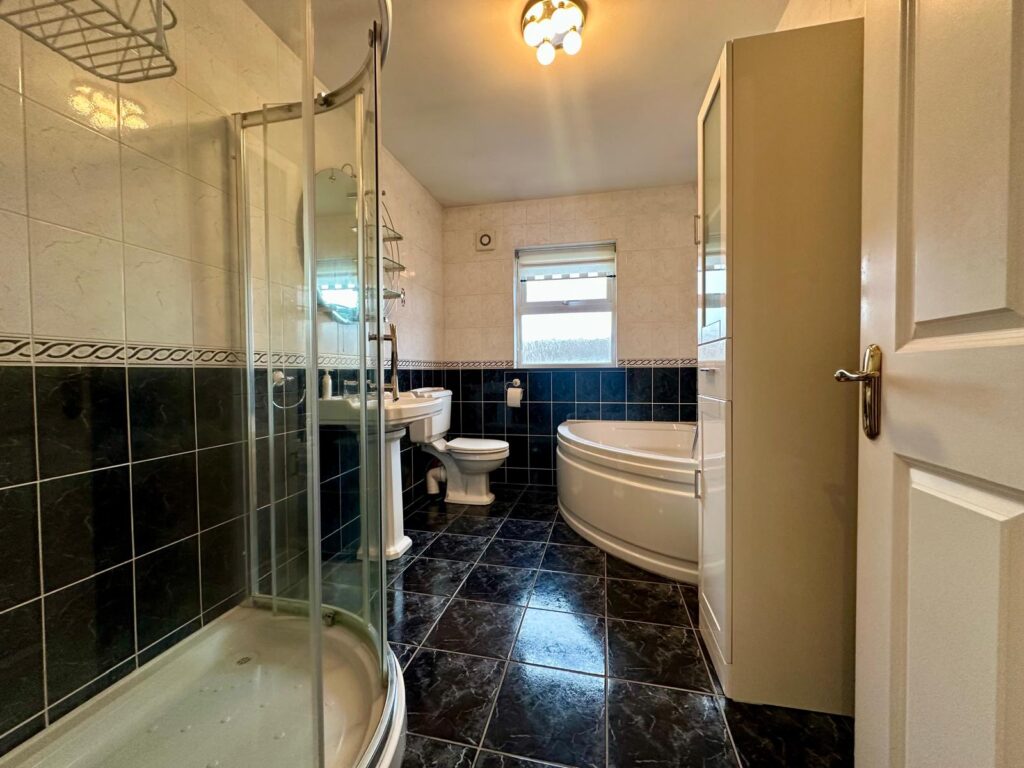 Large corner bath with chrome faucet and shower head, large enclosed shower with Triton T90z electric shower., w.h.b. and w.c. Window overlooking rear garden. |