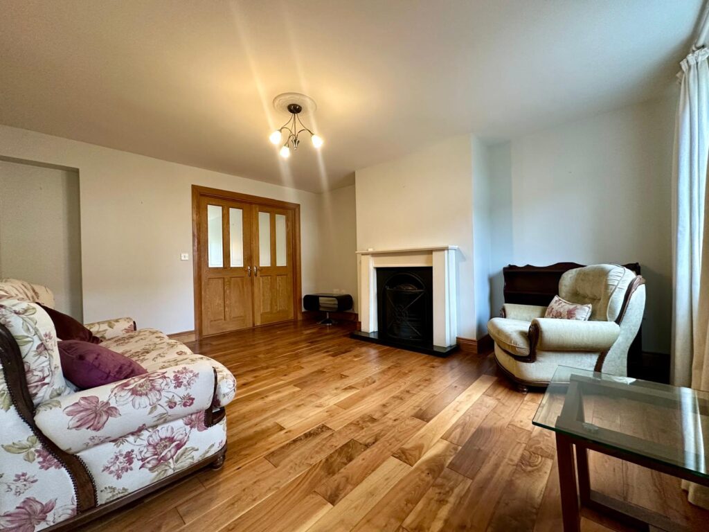 | Sitting Room | 4.81m x 400m | Timber flooring, feature open fireplace with cast iron insert & timber surround. Large windows overlooking front driveway, tv points and electrical points Solid timber with glass in frame double doors leading to: |