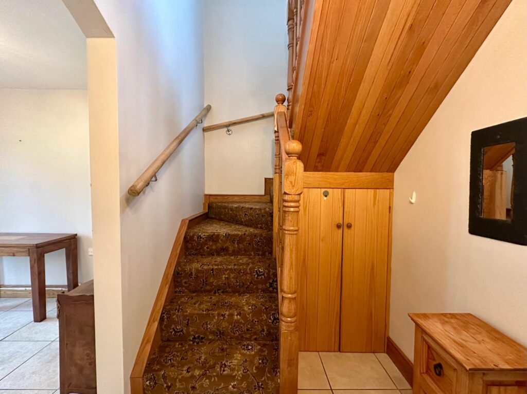| Timber carpeted staircase leading to: | ||
