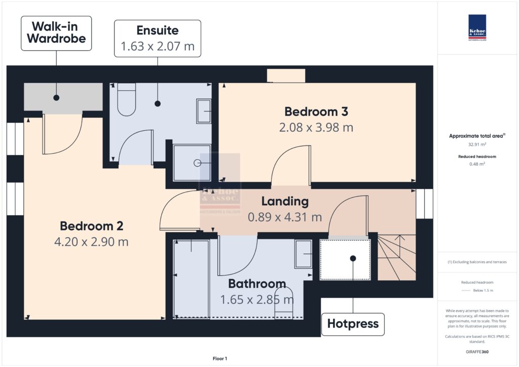 | Ensuite | 2.45m x 0.89m | With tiled flooring, tiled shower stall with electric shower, w.c., w.h.b., understairs storage press |