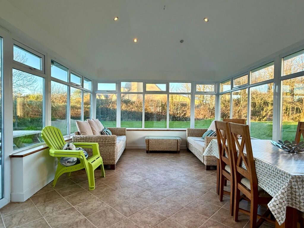 | Large Dining/Sunroom Area | 5.10m x 3.59m | Tiled flooring throughout, double glazed window surround with sliding door patio access leading to westerly fating patio, gardens in lawn. |