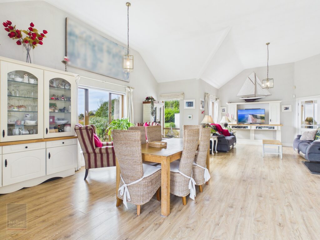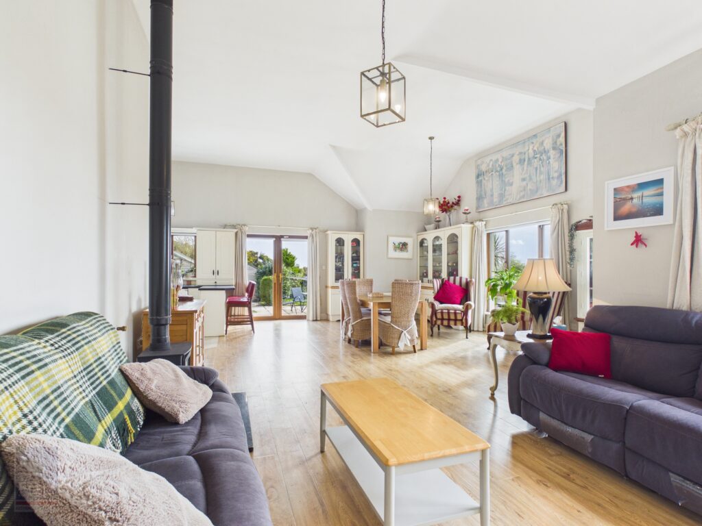 Opel Plan Kitchen/Dining/Sitting Room 9.62m x 8.02m Kitchen Area: Tiled flooring, fully fitted with floor and eye level cabinets, ample worktop space with double drainer stainless steel sink and tiled splashback, drinking water tap with filtration system built in underneath, Zanussi dishwasher, Whirlpool oven, four ring electric hob under extractor fan, Haier fridge freezer (purchased in 2025), breakfast counter area, built in display cabinetry wrapping around the dining area under alcove ceilings measuring 3.68m, timber laminate flooring through this area with multiple aspects of the stunning sea views, solid fuel stove under a polish granite hearth, built in display cabinetry for tv console and radiator covers underneath. From the dining area patio doors leading out to the sandstone large patio area.
