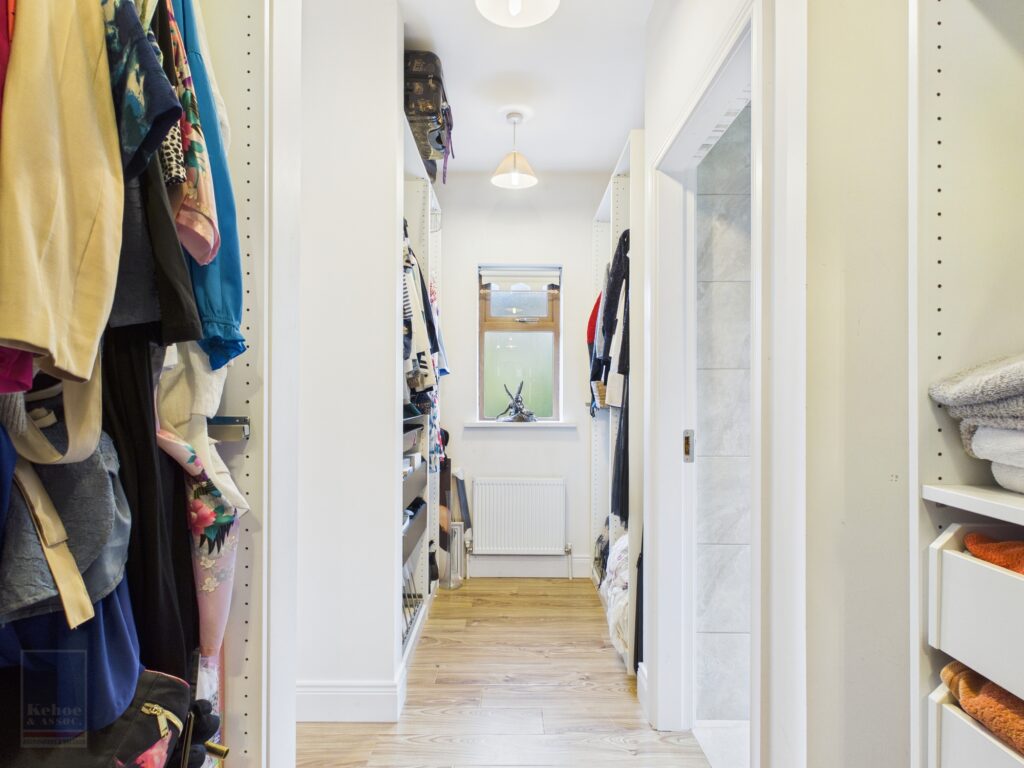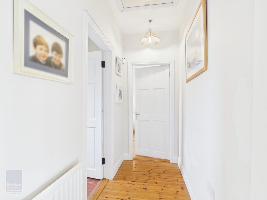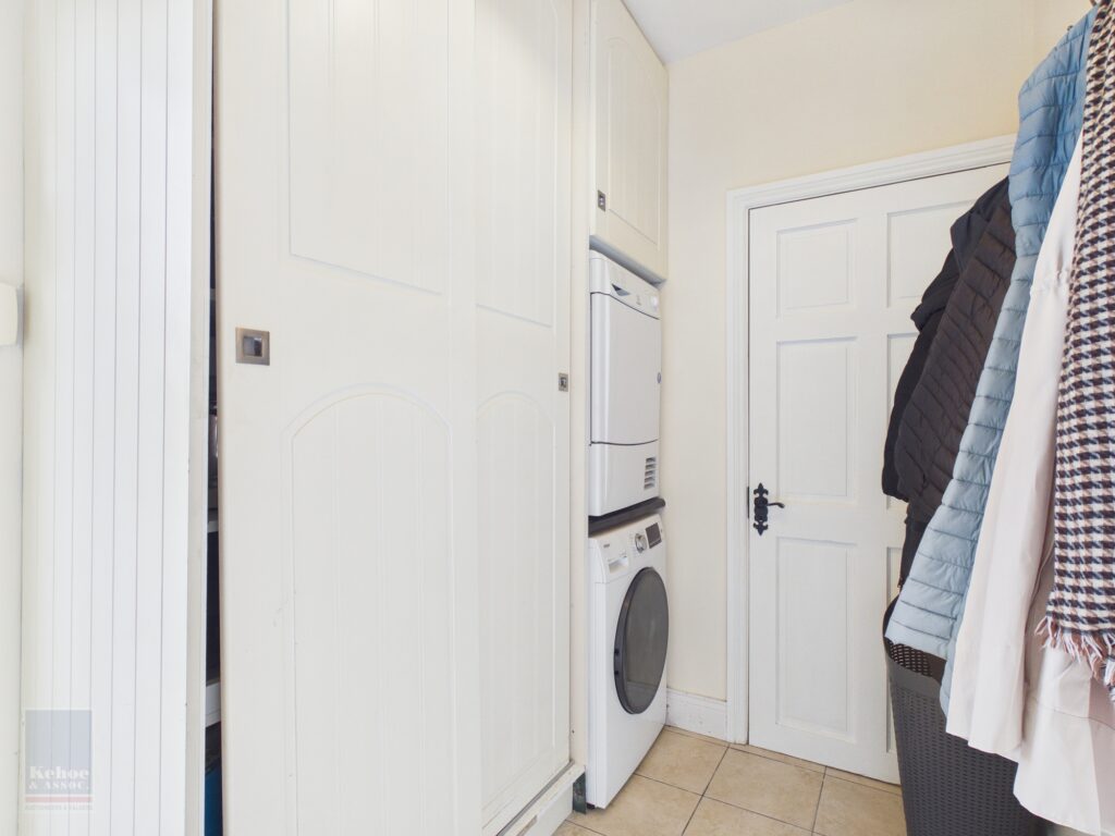 Entrance Hall 3.01m x 1.74m Tiled flooring. Alarm and electrical fuse board. Ample storage space with slide robes to open shelves. Space for washing machine and space for dryer. Door through to hot-press with Eddie hot water system.