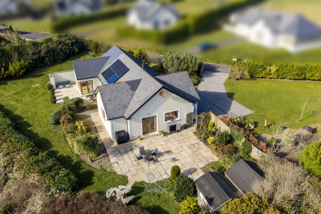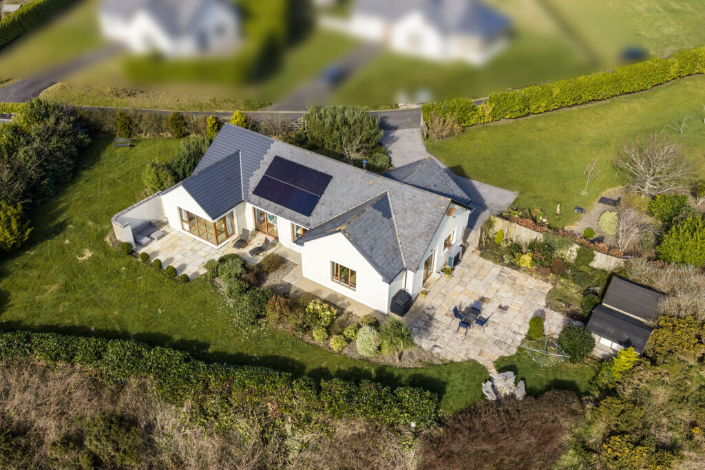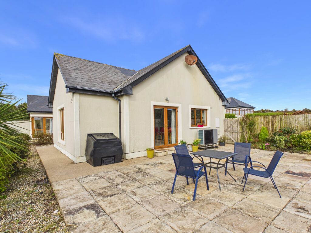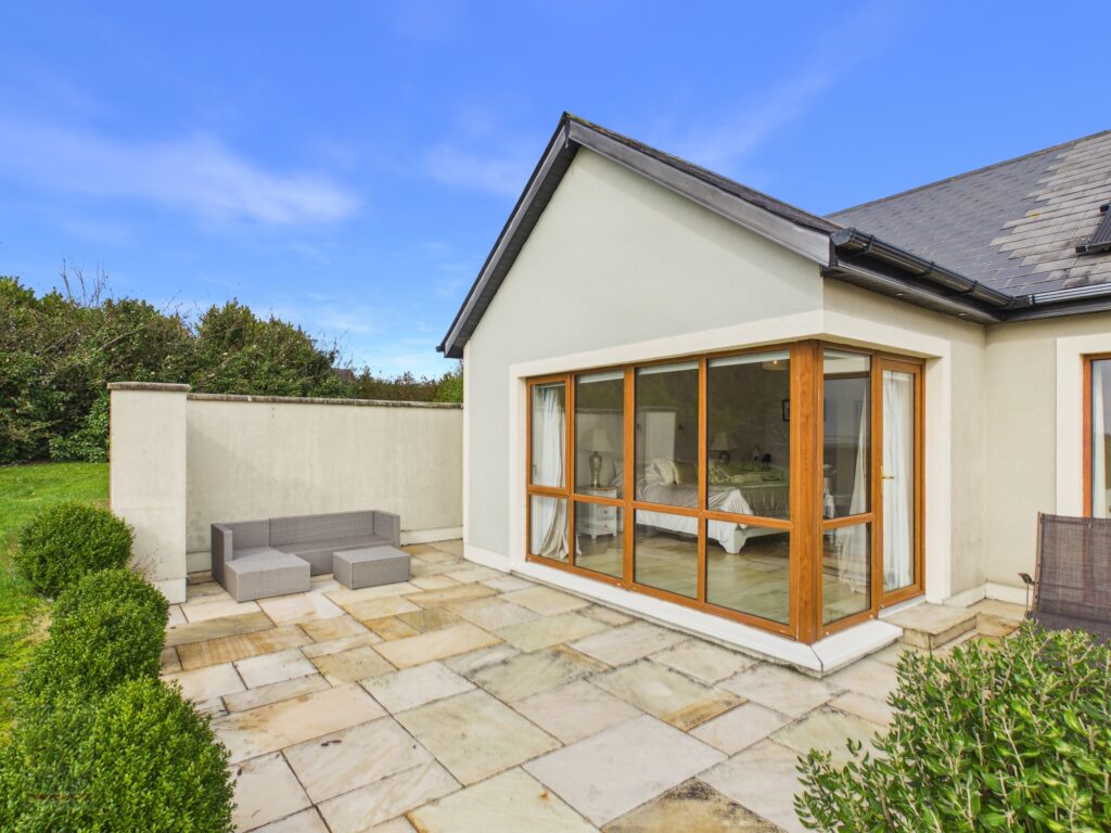 Built in 2004 the property is extending to c. 160 sq. m., which is both spacious and thoughtfully laid out. At the heart of the home lies a bright open plan kitchen/dining/living room, where a solid fuel stove creates a warm and inviting focal point. French doors open onto an extensive wrap-around sandstone patio, perfectly positioned to capture the phenomenal sea views — an idyllic setting for outdoor dining, entertaining, or simply relaxing while taking in the coastal panorama. A utility and plant room provide practical convenience. The property offers three generous bedrooms, including Bedroom 1 and a family bathroom, while Bedroom 2 features slide robes and an ensuite. A separate sitting room, accessed off a second patio area, leads to a private master suite complete with walk-in wardrobe and ensuite, creating a peaceful retreat within the home.