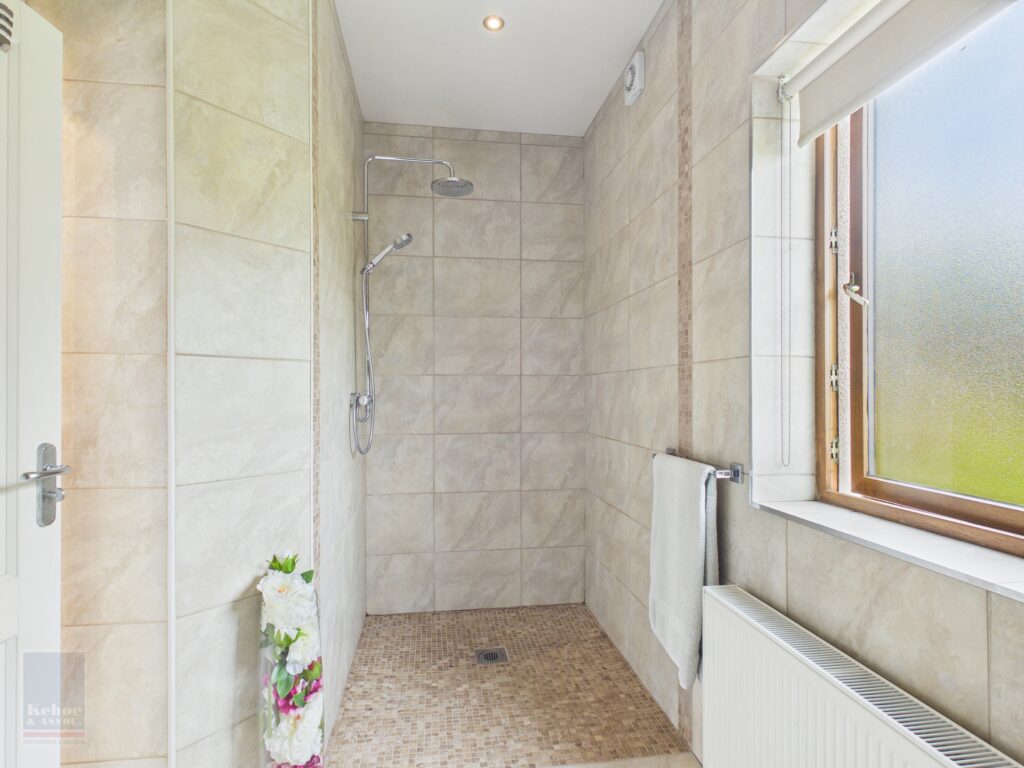 Large En Suite 4.16m x 1.81m Tiled flooring, wet room style with mosaic tile flooring, pressure pump shower, rainwater shower head and separate faucet, recess lights throughout, w.h.b with mirror and lighting overhead and w.c.