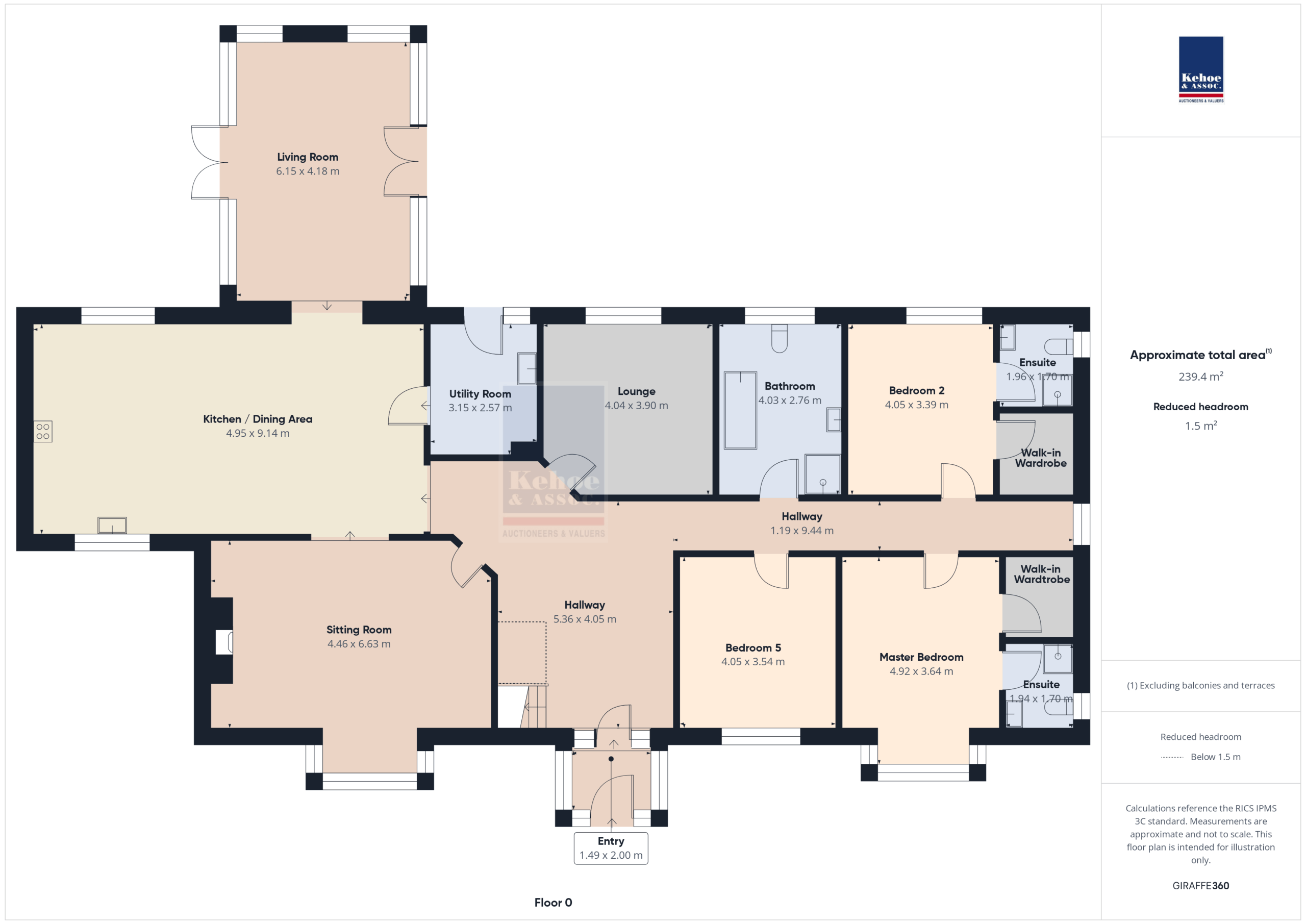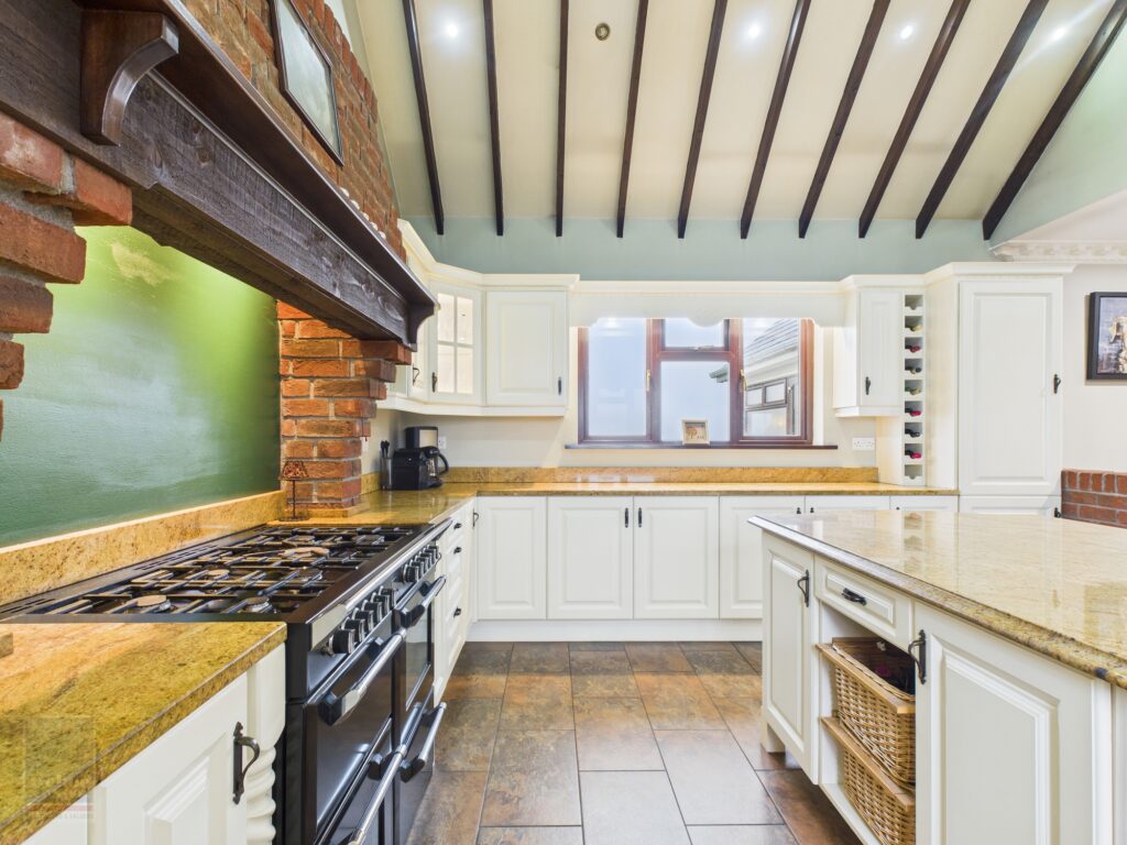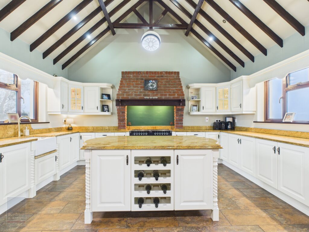 Kitchen 4.91m x 4.01m With tiled flooring, vaulted ceiling with exposed timber beams, recessed lighting, extensive floor and eye level units, kitchen island unit, granite countertop & splashback, Belfast sink, integrated larder fridge, integrated larder freezer, Stoves electric range cooker with 7-ring gas hob and feature red brick surround.