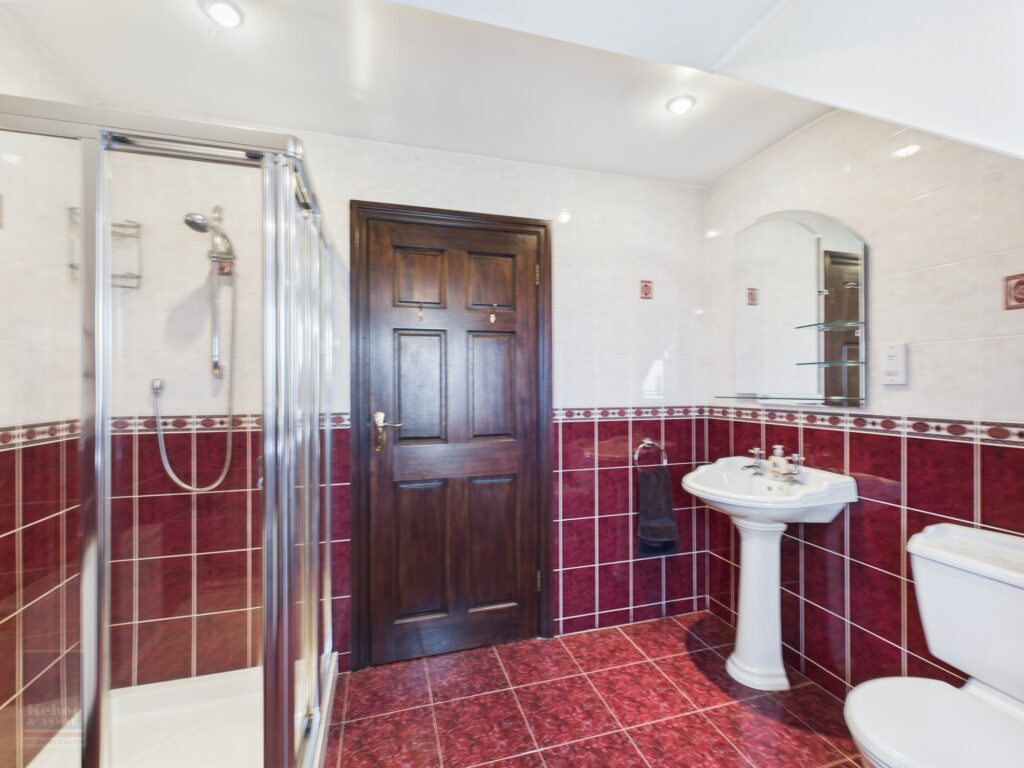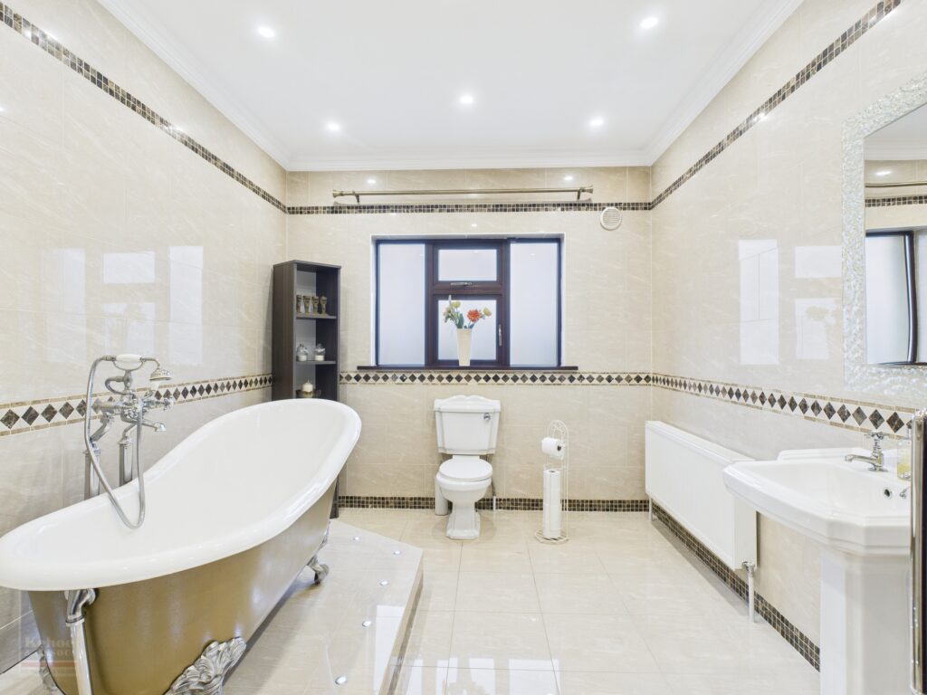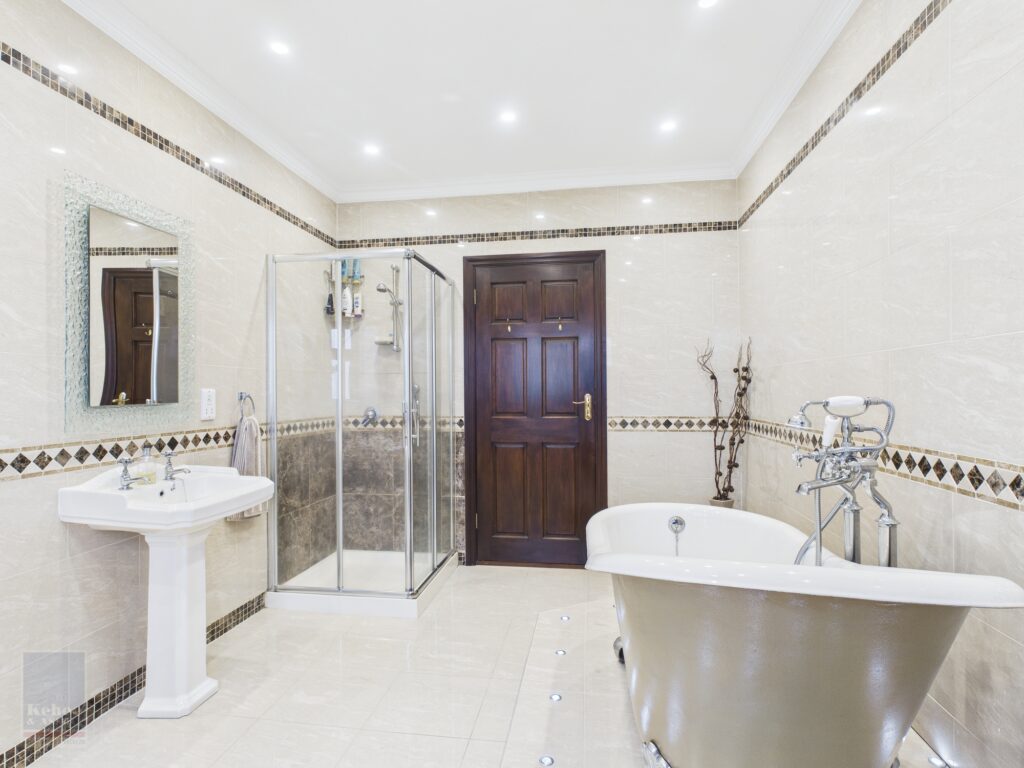 Family Bathroom 4.03m x 2.75m Fully tiled, ceiling coving, recessed lighting, feature raised free-standing bath with LED surround lighting, w.c., w.h.b. and shower stall with pump shower.