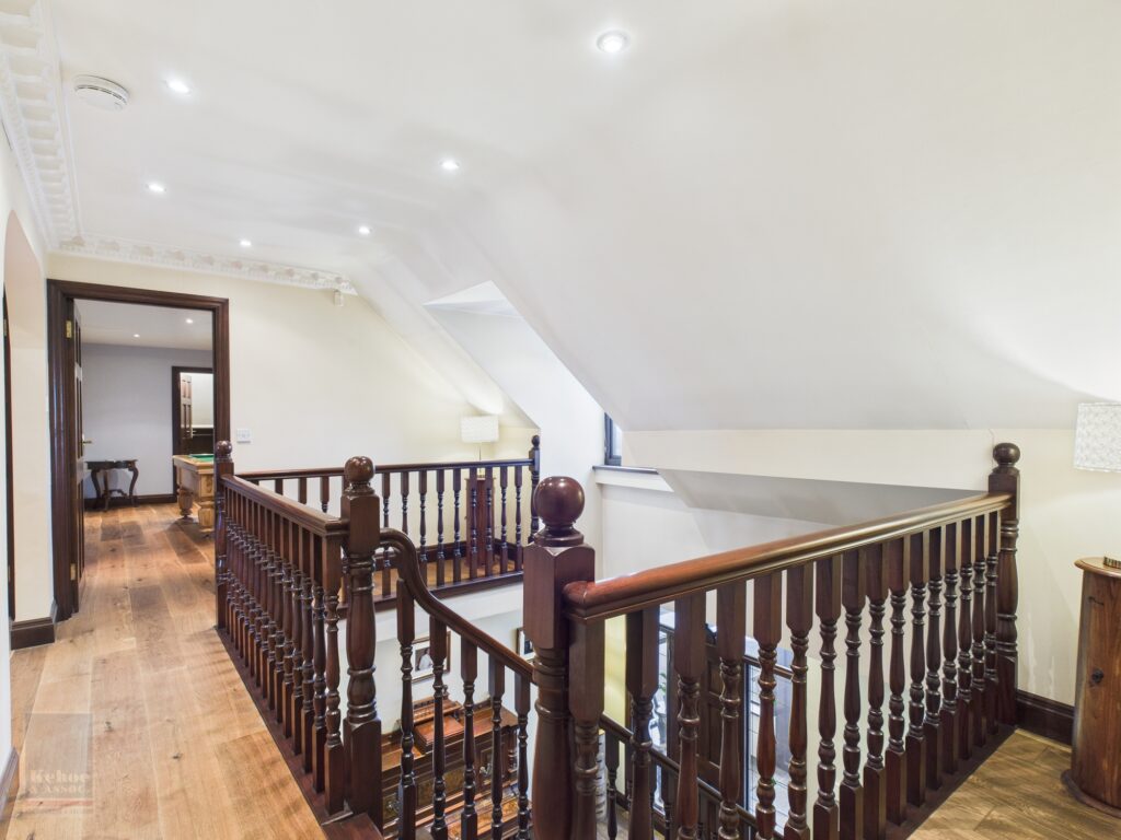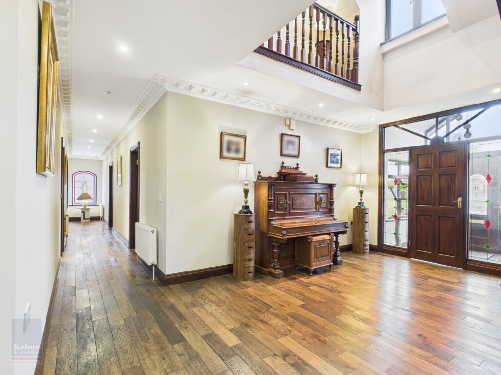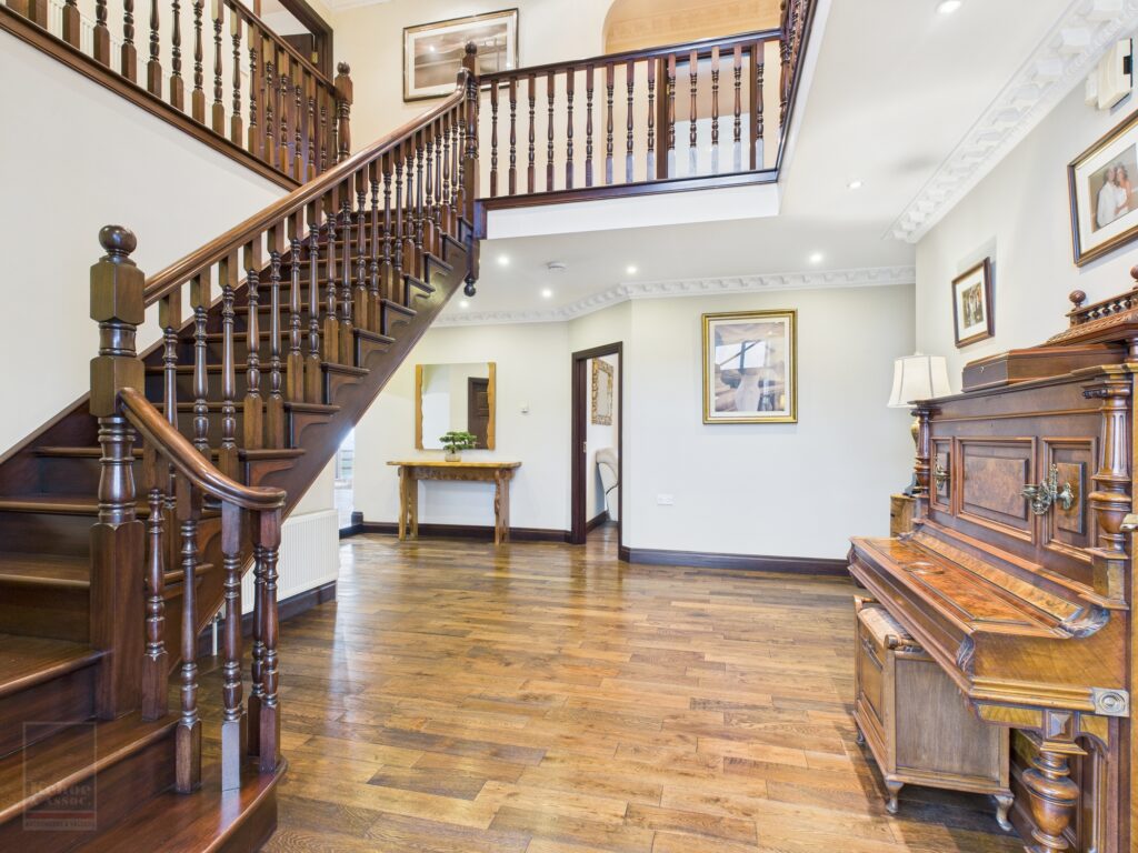 Ballyhurst is a one-of-a-kind family residence extending to c. 363 sq. m. / 3,907 sq. ft., meticulously designed and finished to an exceptional standard throughout. This state-of-the-art home combines timeless elegance with cutting-edge efficiency, boasting a B3 BER, four-zone smart-controlled heating system, and a fully alarmed security system. From the moment you enter, the sense of grandeur is undeniable. The expansive entrance hallway, adorned with ornate ceiling coving, sets the tone for the superb quality that follows.