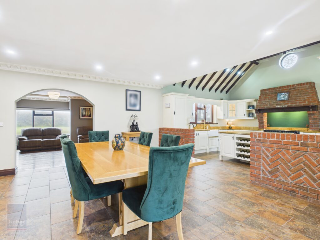 At the heart of the home lies a magnificent open-plan kitchen, dining, and living area — a truly impressive space for family life and entertaining alike. The kitchen features a vaulted ceiling with exposed timber beams, a central island that takes pride of place, a Belfast sink and striking granite worktops and splashback. A red brick surround frames the range cooker, blending traditional craftsmanship with modern luxury. The kitchen and dining area flow through archways into both the living room and the sitting room, creating a seamless connection between spaces.