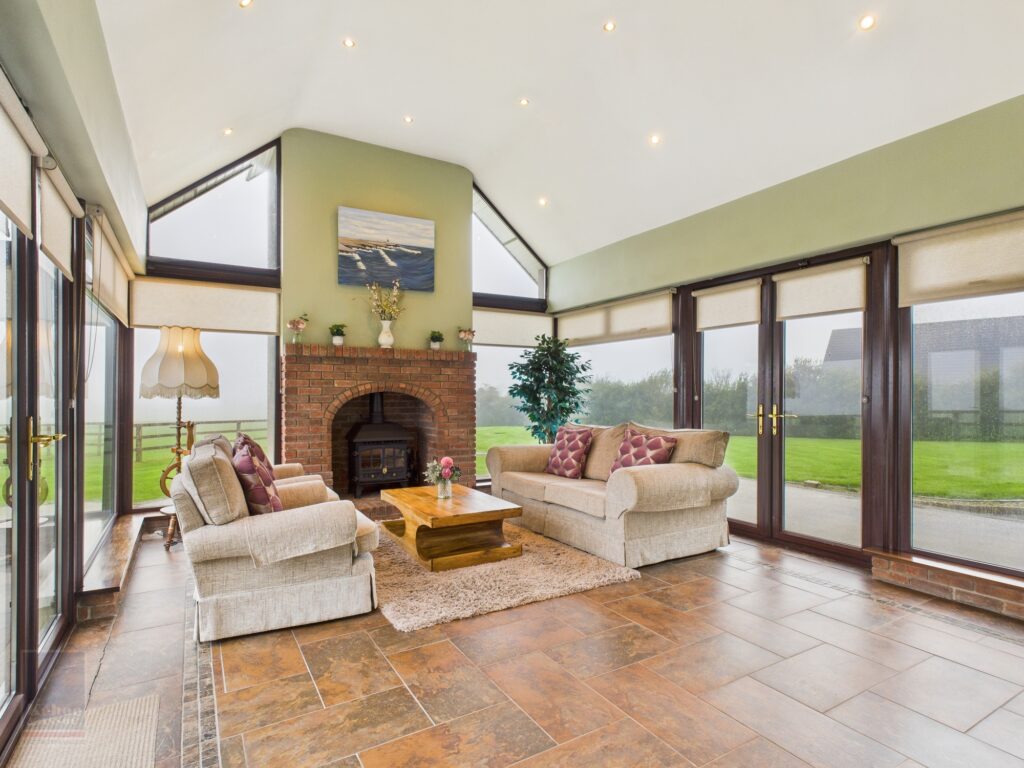 Living Area 6.15m x 4.20m With tiled flooring, vaulted ceiling with recessed lighting, triple aspect windows, dual French doors to rear patio / garden area, free standing solid fuel stove with feature red brick surround and hearth.