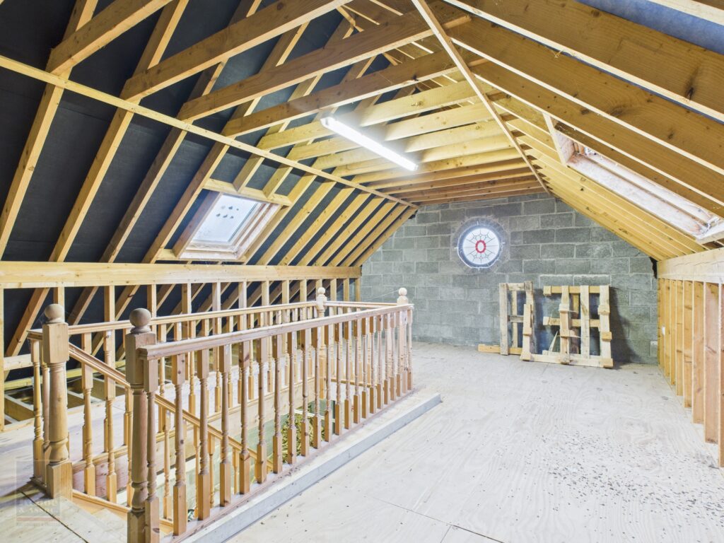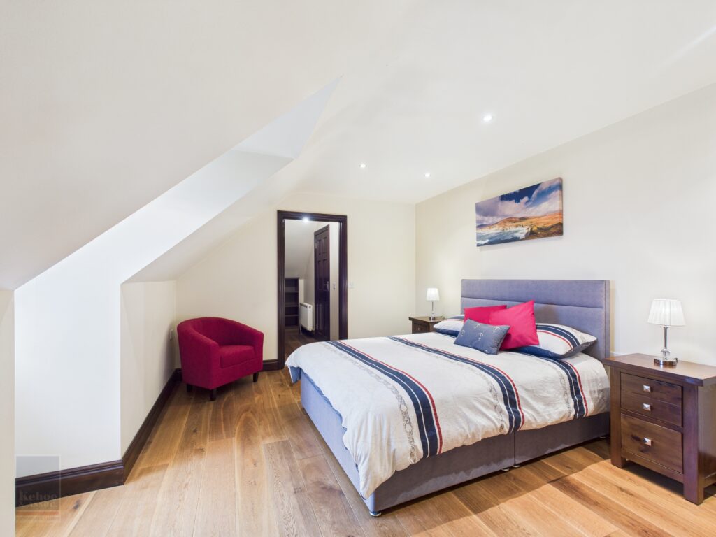 The living room boasts a vaulted ceiling and triple-aspect windows that flood the room with natural light also offering panoramic views of the surrounding countryside. French doors on either side of the room open directly to the rear garden, inviting a gentle indoor-outdoor flow. The sitting room, by contrast, exudes warmth and intimacy — the perfect place to unwind by the solid-fuel stove on winter evenings. Also on the ground floor is an independent lounge room, ideal as a family snug or media room. The luxurious family bathroom features a raised freestanding bathtub, surrounded by LED uplighting that creates an indulgent spa-like atmosphere.