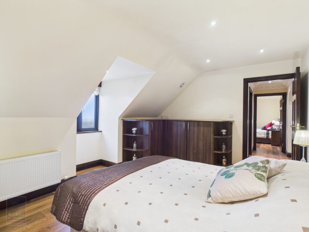 Accommodation on this level includes a guest bedroom, the master suite with bay window, en-suite shower room, and walk-in wardrobe, and bedroom two, which also enjoys an en-suite and walk-in wardrobe. Upstairs, the accommodation continues to impress. There are two further bedrooms, each with a walk-in wardrobe and en-suite shower room, together with a home office, a spacious pool room with access to a dedicated storage room, and a family bathroom on the landing. Every inch of this residence has been thoughtfully designed for comfort, flexibility, and style.
