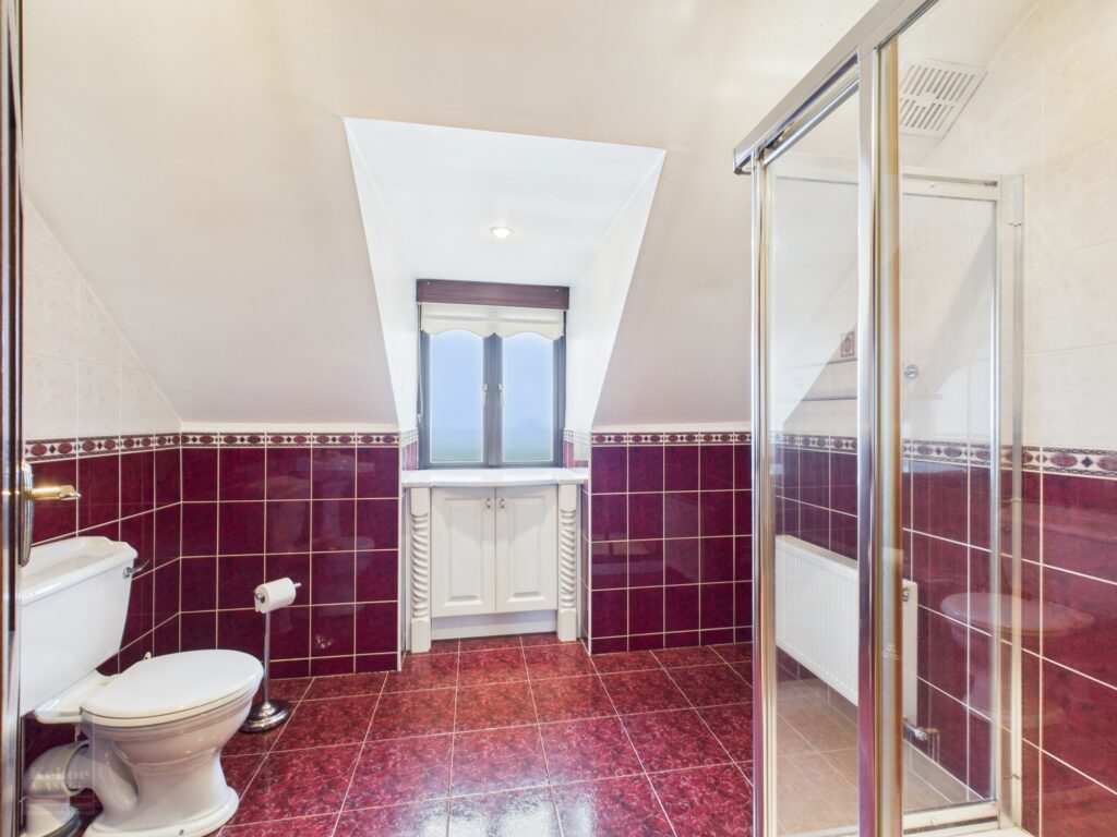 Ensuite 1.95mx 1.70m Fully tiled, ceiling coving, recessed lighting, w.c., w.h.b. with vanity unit and shower stall with pump shower.