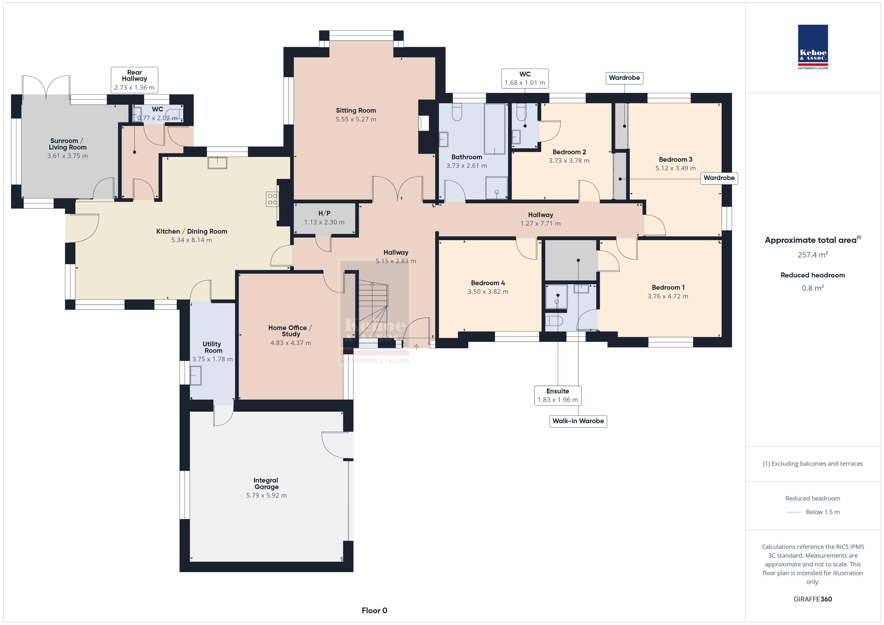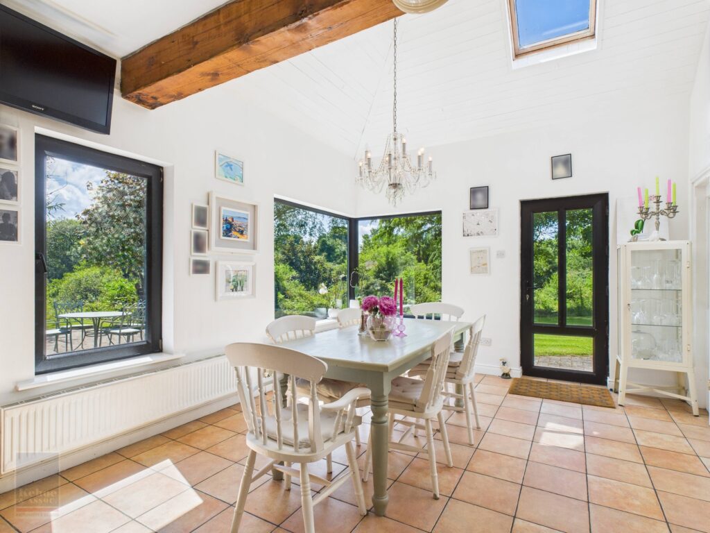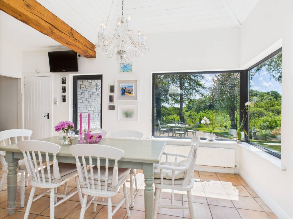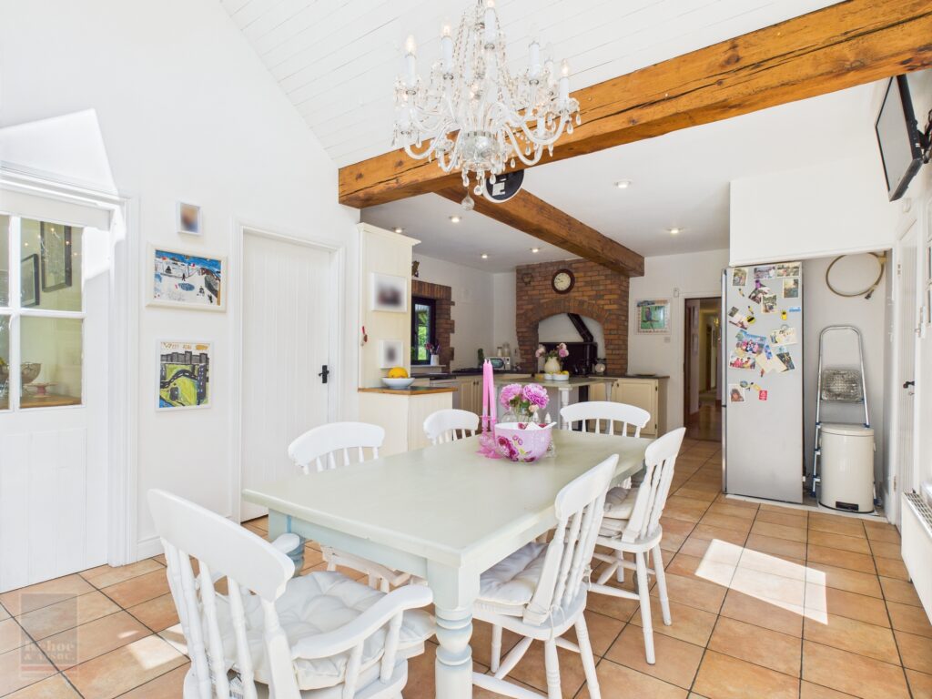 Internally, the property is equally captivating. The sitting room forms the heart of the home, with a vaulted ceiling, exposed timber beams, and a raised fireplace lending a warm and inviting ambience. The accommodation is thoughtfully arranged and includes 4 bedrooms, with the master suite featuring a walk-in wardrobe and ensuite bathroom. A large home office provides flexibility and could easily function as an additional lounge area. The kitchen and dining room flow seamlessly to a south-facing sunroom, where natural light floods in and double doors open onto a patio area — perfect for al fresco dining and entertaining. A spacious utility room and access to the integral garage complete the ground floor accommodation.