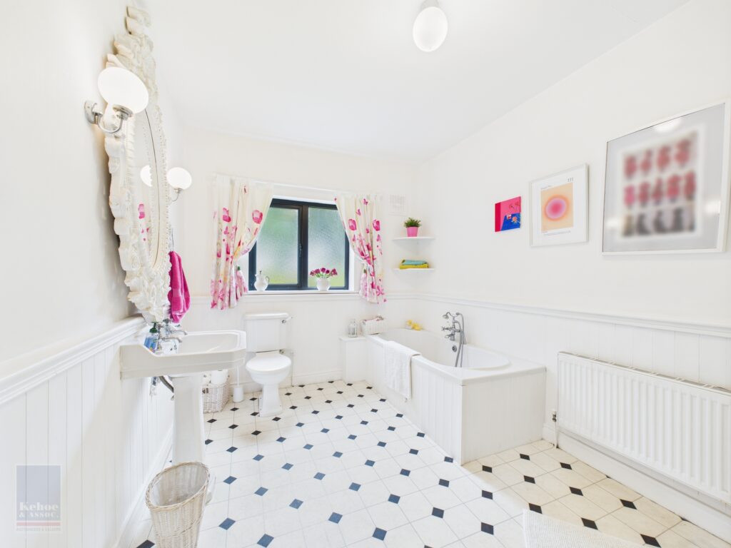 Family Bathroom 3.76m x 2.66m Lino flooring, wall panelling, bath, w.c., w.h.b., Mira power shower stall and tiled surround.