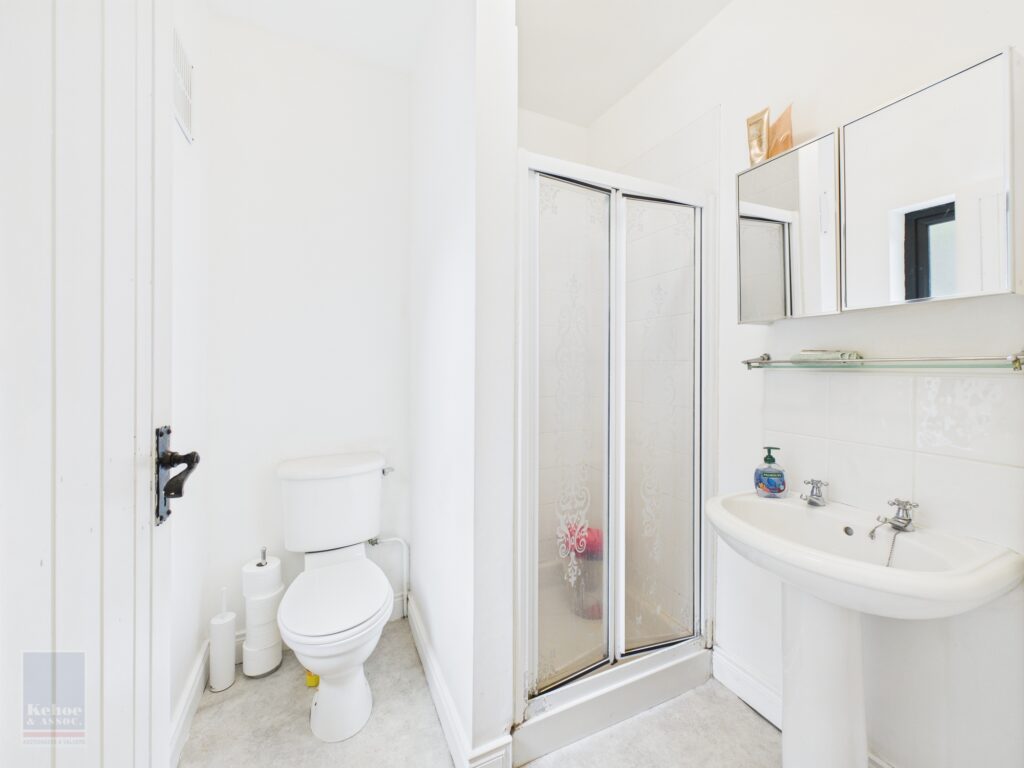 Ensuite 1.97m x 1.84m Lino flooring, w.c., w.h.b., shower stall with Mira power shower and tiled surround.