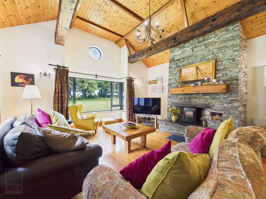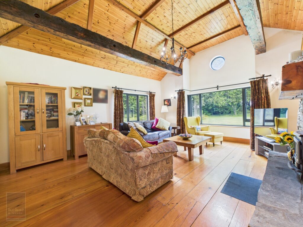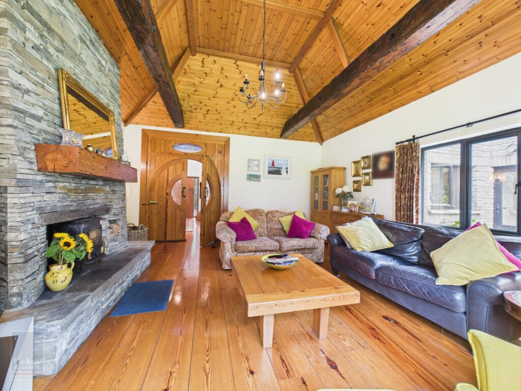 Sitting Room 5.57m x 5.31m Pitch pine flooring, pitch pine double doors, vaulted ceiling with exposed Harland and Wolff timber beams from Belfast slipway, dual aspect windows, feature bay window with sailors window above, raised solid fuel stove with granite hearth and Paulstown Quarry, Kilkenny dry stone surround.