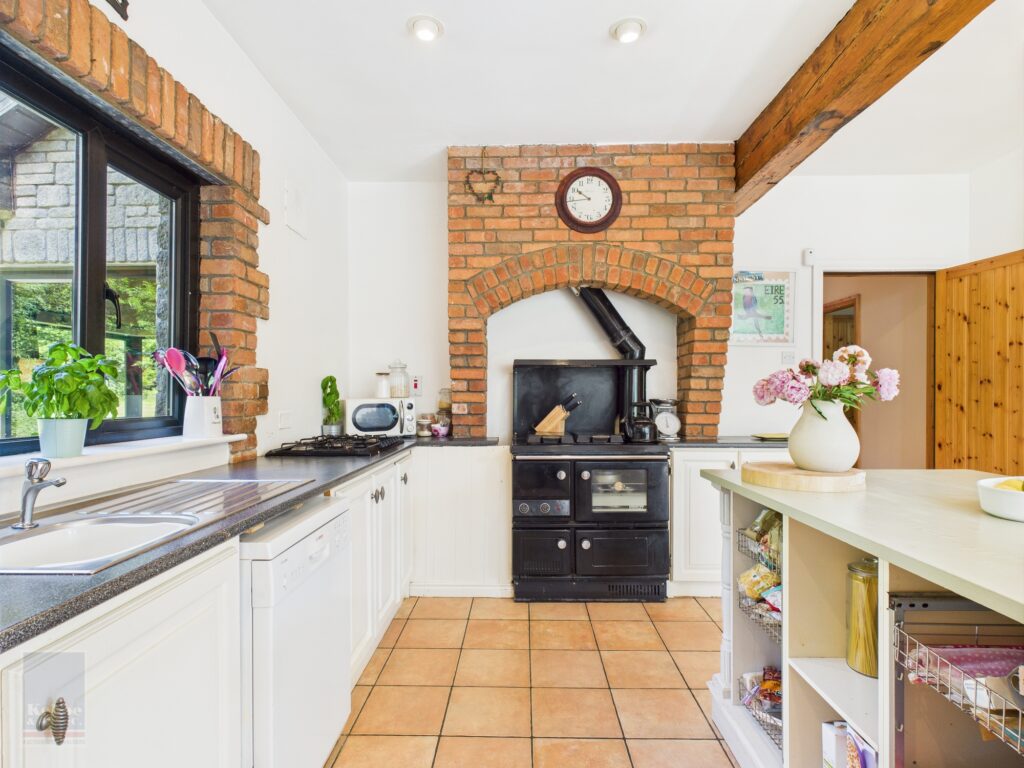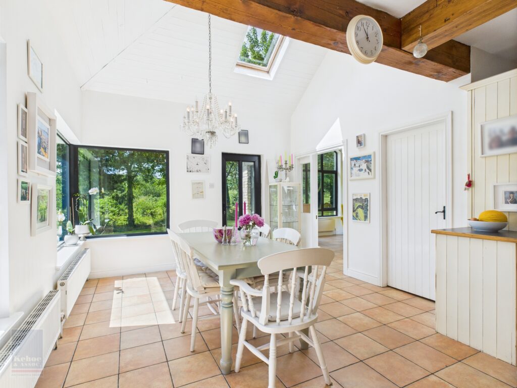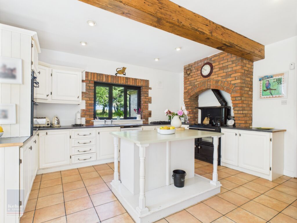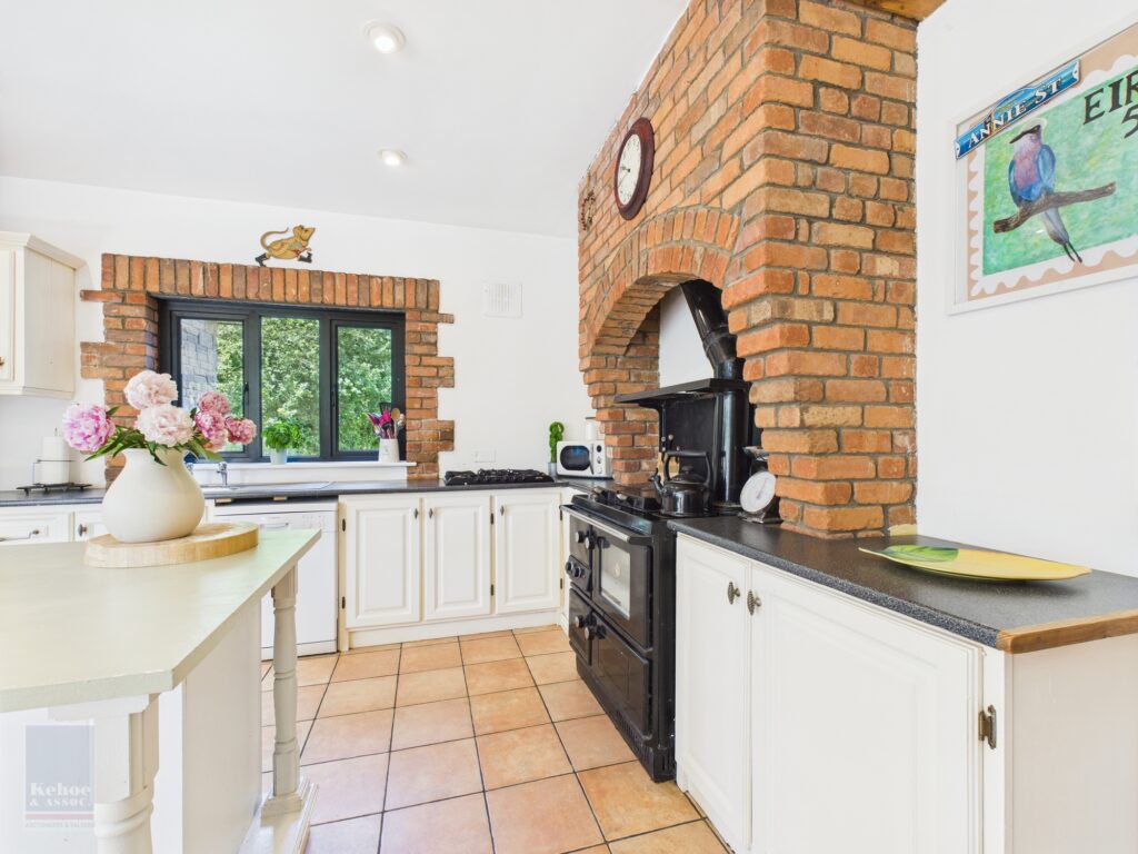 Kitchen / Dining Area 8.17m x 5.38m Tiled floor, floor and eye level units, integrated Neff oven, microwave, integrated dishwasher, red brick feature wall, 5-ring Smeg gas hob, Siemens fridge, kitchen island unit, exposed timber beams from The Pillar, Wexford and vaulted ceiling over dining area.
