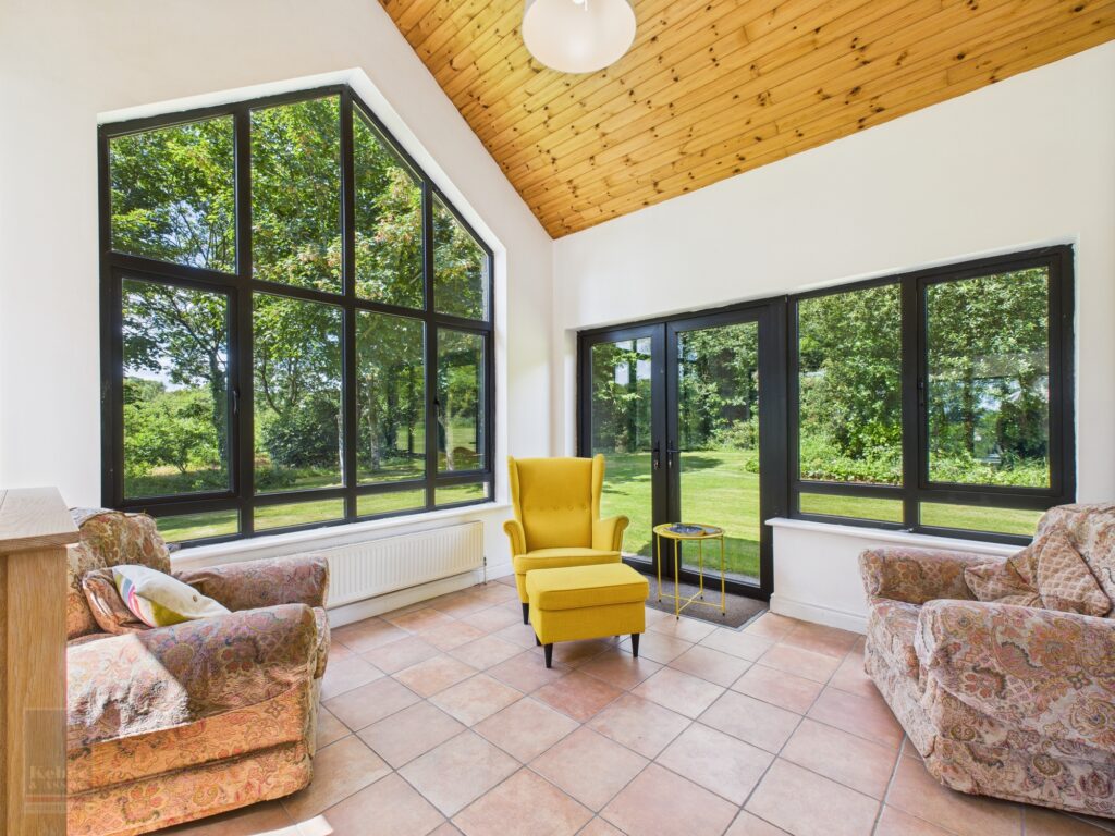 Sunroom / Living Room 3.76m x 3.61m Tiled floor, vaulted ceiling, triple aspect windows and French doors to rear garden area.