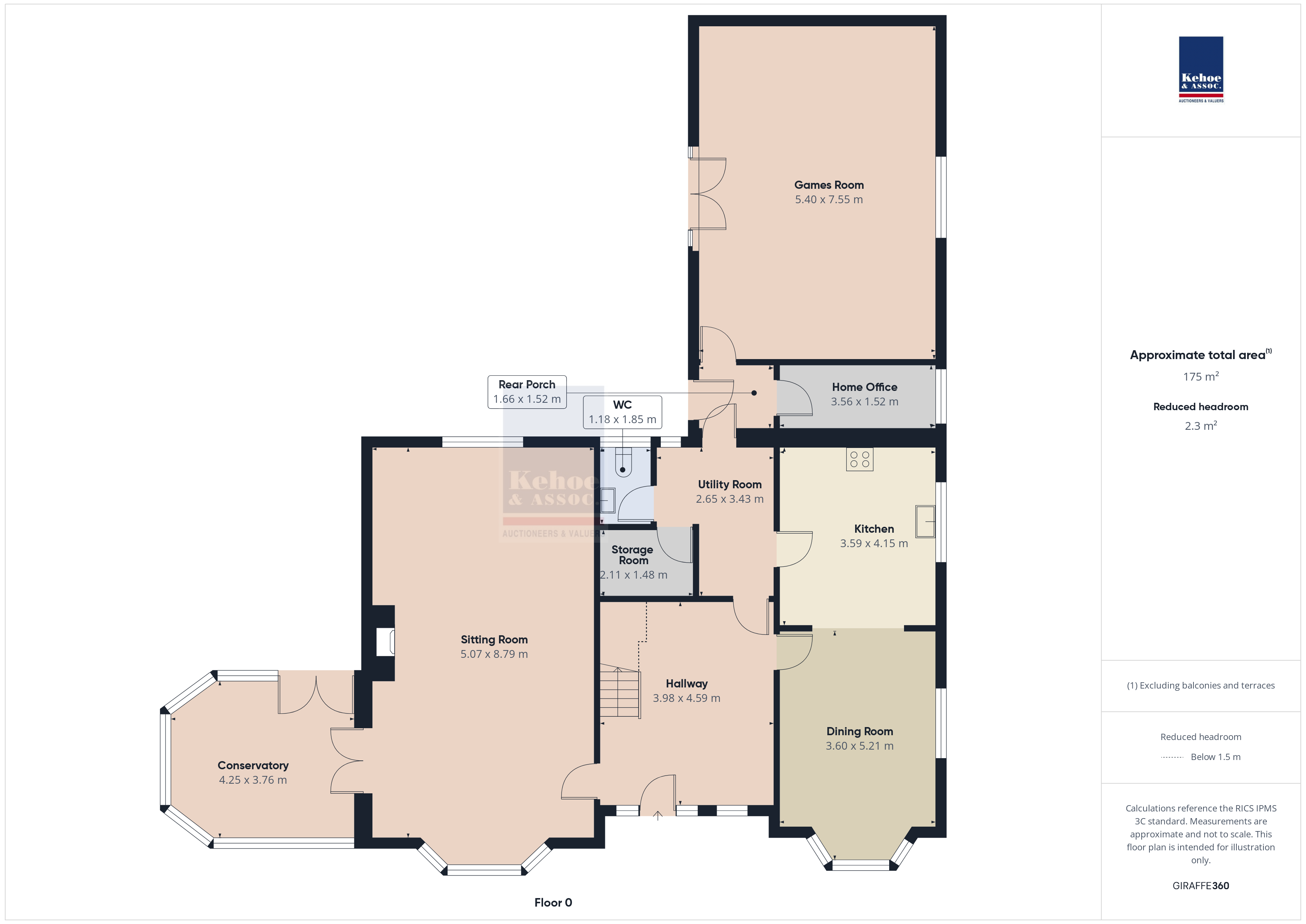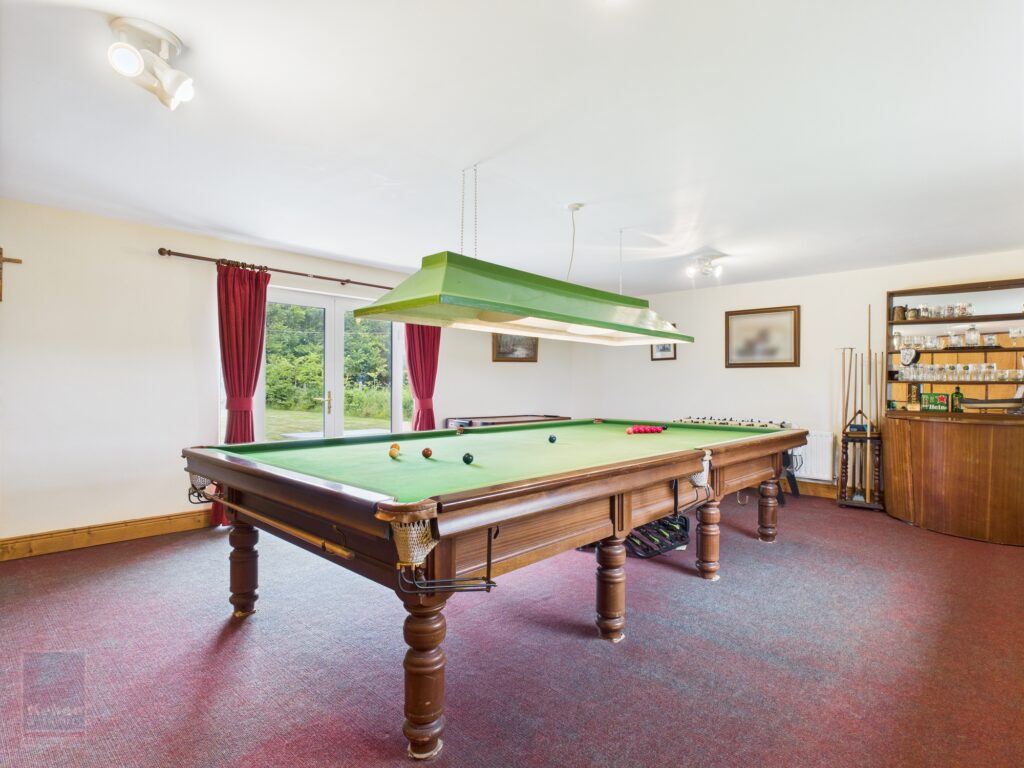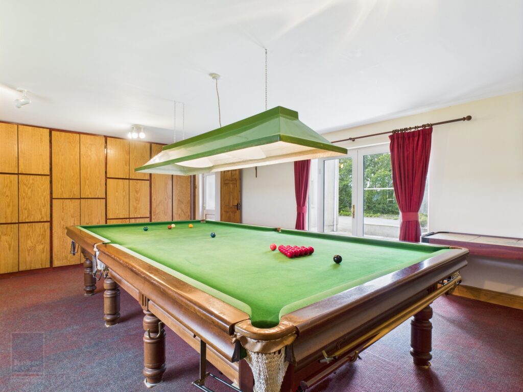 | Games Room | 7.56m x 5.38m | Carpet flooring, snooker table, mini-bar, extensive storage units and French doors to rear patio area. |