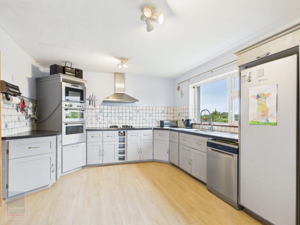 | Kitchen | 4.30m x 3.60m | Laminate flooring, fitted kitchen units with integarated double oven, imntegrated microwave, 4-ring gas hob with overhead extractor, integrated fridge freezer, integrated dishwasher and tiled splashback. |