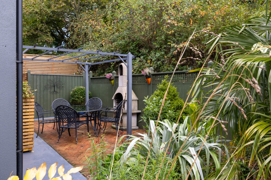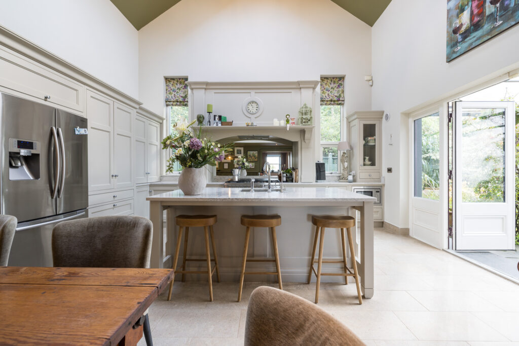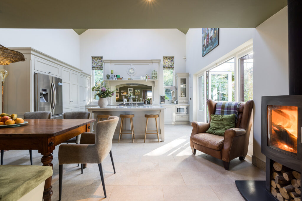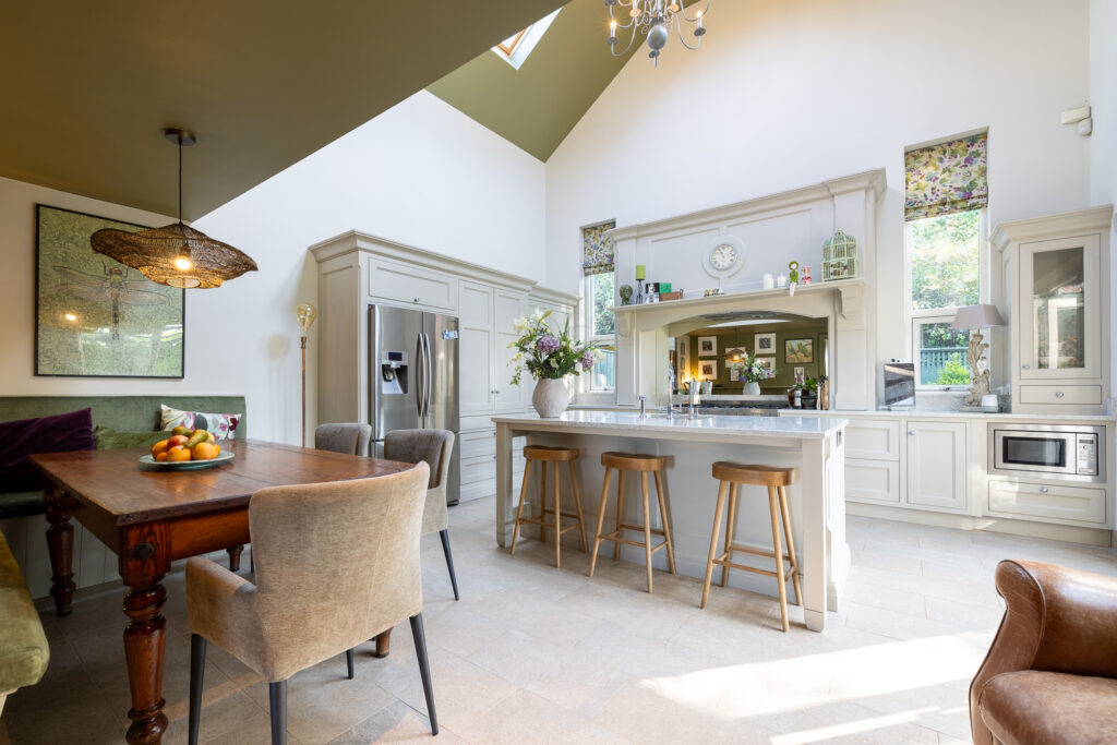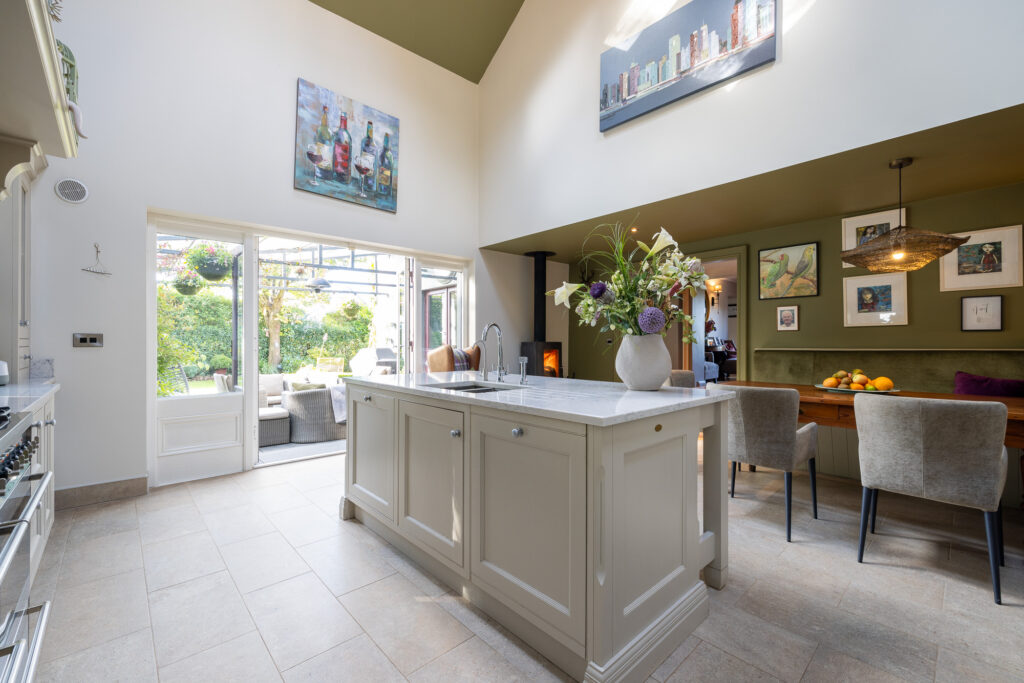 | Magnificent Kitchen | 5.83m x 5.21m | Tiled flooring throughout, built in custom made family dining booth with concealed radiator, solid fuel wood burning stove, magnificent bespokely made Sweeneys kitchen with a shaker doors style and large central island, the island includes breakfast bar counter area, marble worktop, stainless sink with cut drainer, fresh filtered water tap and chrome fittings, integrated Bosch dishwasher. Kitchen continues to provide all modern comforts with concealed doors to electric kettle and cabinet space, Smeg dual fuel oven with electric ovens and 6 ring gas hob and induction hob space, integrated Neff microwave. Ceiling heights reaching to 5.47m high with an alcove space and four Velux’s overhead. French doors leading out to central garden space with the pergola area and patio ideal in all weather conditions. |